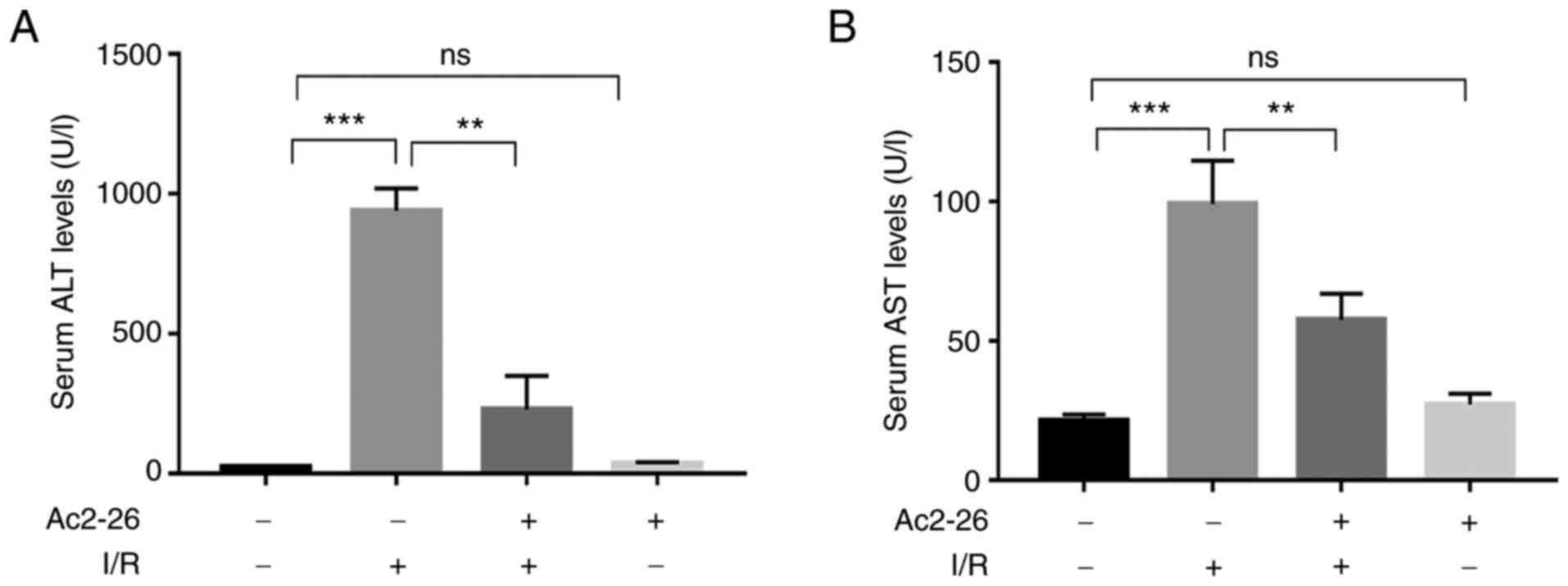A week later, before the operation, the animals were randomly allocated into sham, I/R, I/R + Ac2-26 and Ac2-26 groups (n=6). Mice in the I/R + Ac2-26 group were administered Ac2-26 at a dose of 250 µg/kg via intraperitoneal injection 30 min before ischemia, whereas those in the sham and Ac2-26 groups received the same anesthetic and laparotomy, with the exception of surgery. Briefly, mice were anesthetized via intraperitoneal injection of 1% pentobarbital sodium (40 mg/kg) and the left and middle branches of the hepatic pedicle were occluded by clamping them with a noninvasive vascular clip for 45 min, followed by 24 h of reperfusion. The liver color change from red to dark purple, which indicated that the model was successfully established. Body temperature was maintained with an appropriative heating pad at 37±0.4˚C upon surgical procedures. Animals were provided food and water after fully awake. During the operation three mice succumbed due to intraoperative bleeding (mortality rate of 4.2%). Animal's health and behavior was monitored every half hour after surgery, including respiratory rate and depth, mucous membrane coloration and wounds.