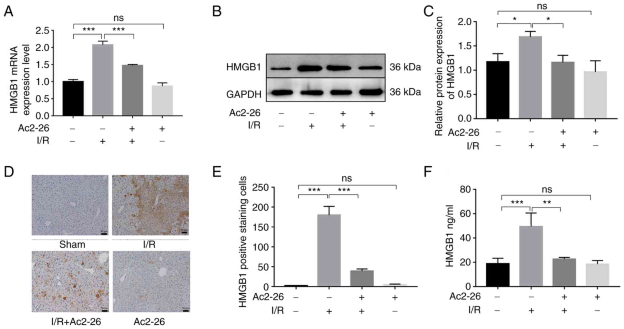 Meanwhile, immunohistochemical staining showed that there was almost no HMGB1-positive reaction in the hepatocytes of the sham group. However, the hepatocytes of the I/R group showed increased levels of HMGB1 within the cytoplasm. By contrast, pretreatment with Ac2-26 clearly reduced the expression of HMGB1 (P<0.001; Fig. 2D and E). Further, the serum level of HMGB1 was increased in the I/R group (P<0.001), but in the Ac2-26-treated group, it was significantly reduced (P<0.01) (Fig. 2F). These results demonstrated that Ac2-26 inhibited the overexpression and release of HMGB1 caused by HIRI.