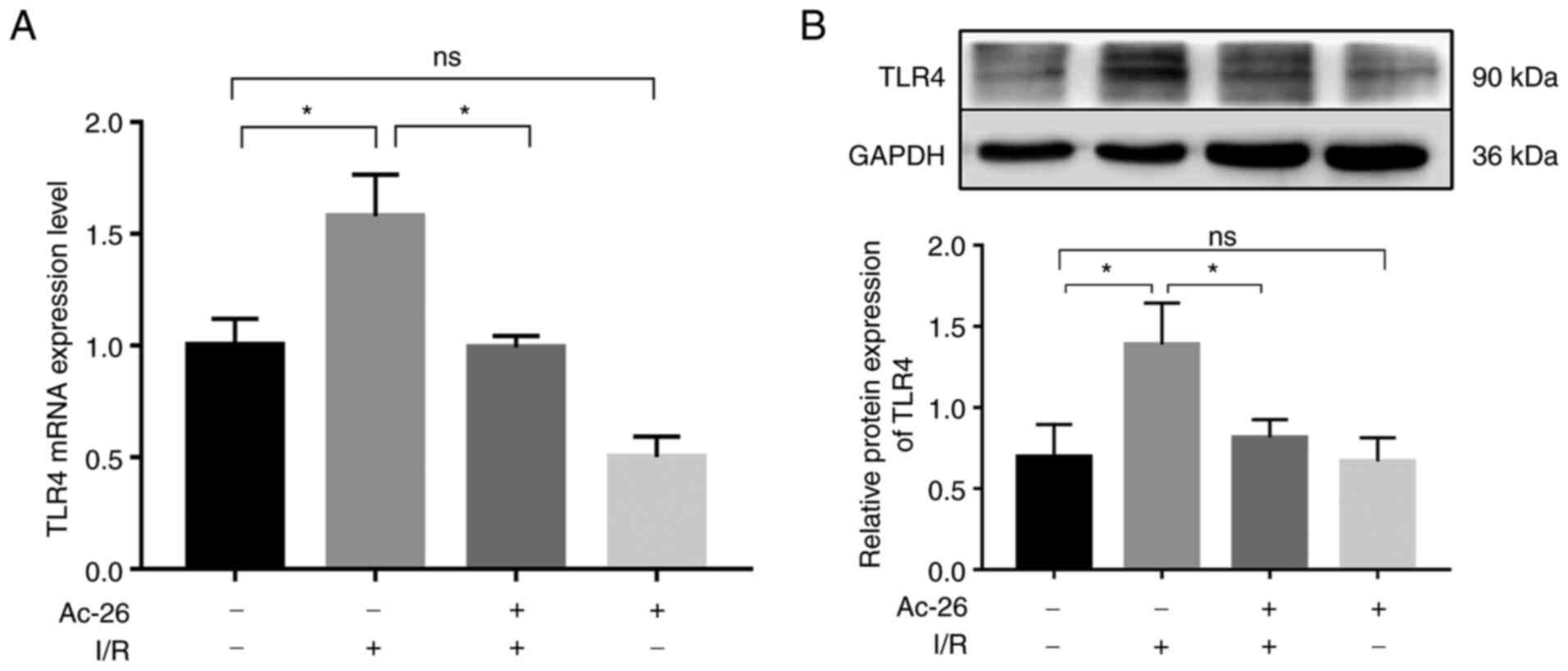 In addition, the expression of IκBα was notably reduced (P<0.05) following I/R, but this effect was reversed by Ac2-26 treatment (Fig. 4B and D). These data suggested that Ac2-26 preconditioning may suppress the inflammatory response induced by HIRI by targeting the TLR4/NF-κB signaling pathway.