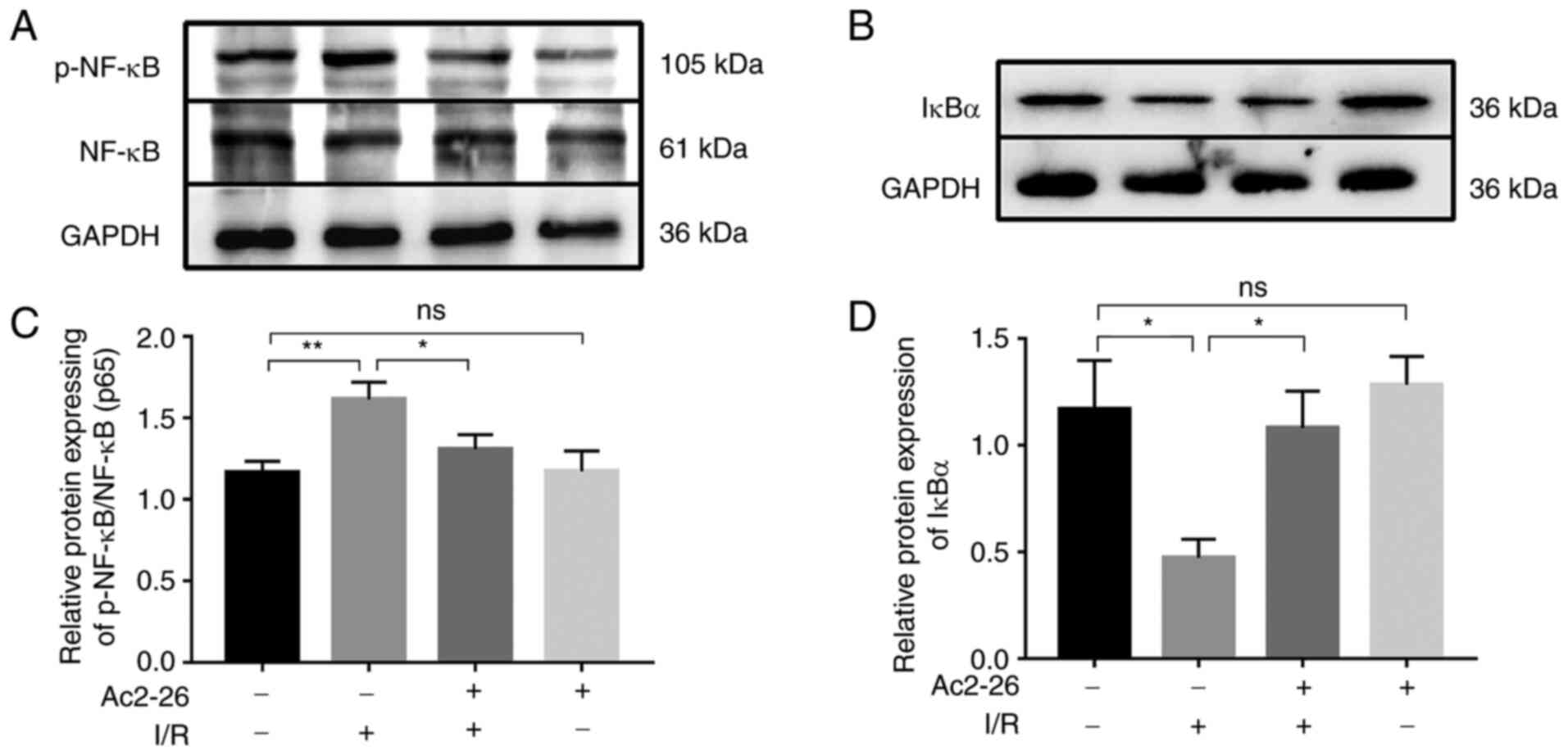 Previous studies have shown that Ac2-26 exhibits beneficial effects in the treatment of mucosal inflammation, wound healing and I/R injury models (11,21,31). The positive feedback between proinflammatory cytokines and NF-κB signaling is blocked by Ac2-26 pretreatment, which alleviates the inflammation (32). A substantial increase in NF-κB activity along with a decrease in IκBα was observed in the present study and Ac2-26 pretreatment was sufficient to downregulate NF-κB via the expected upregulation of IκBα, which served an anti-inflammatory role. This observation supported the results of previous studies (21), which demonstrate that Ac2-26 treatment can significantly improve the perioperative resolution of inflammation during I/R injury. This effect was associated with the Ac2-26-mediated inhibition of NF-κB signaling and the normalization of pro-inflammatory signaling molecules.