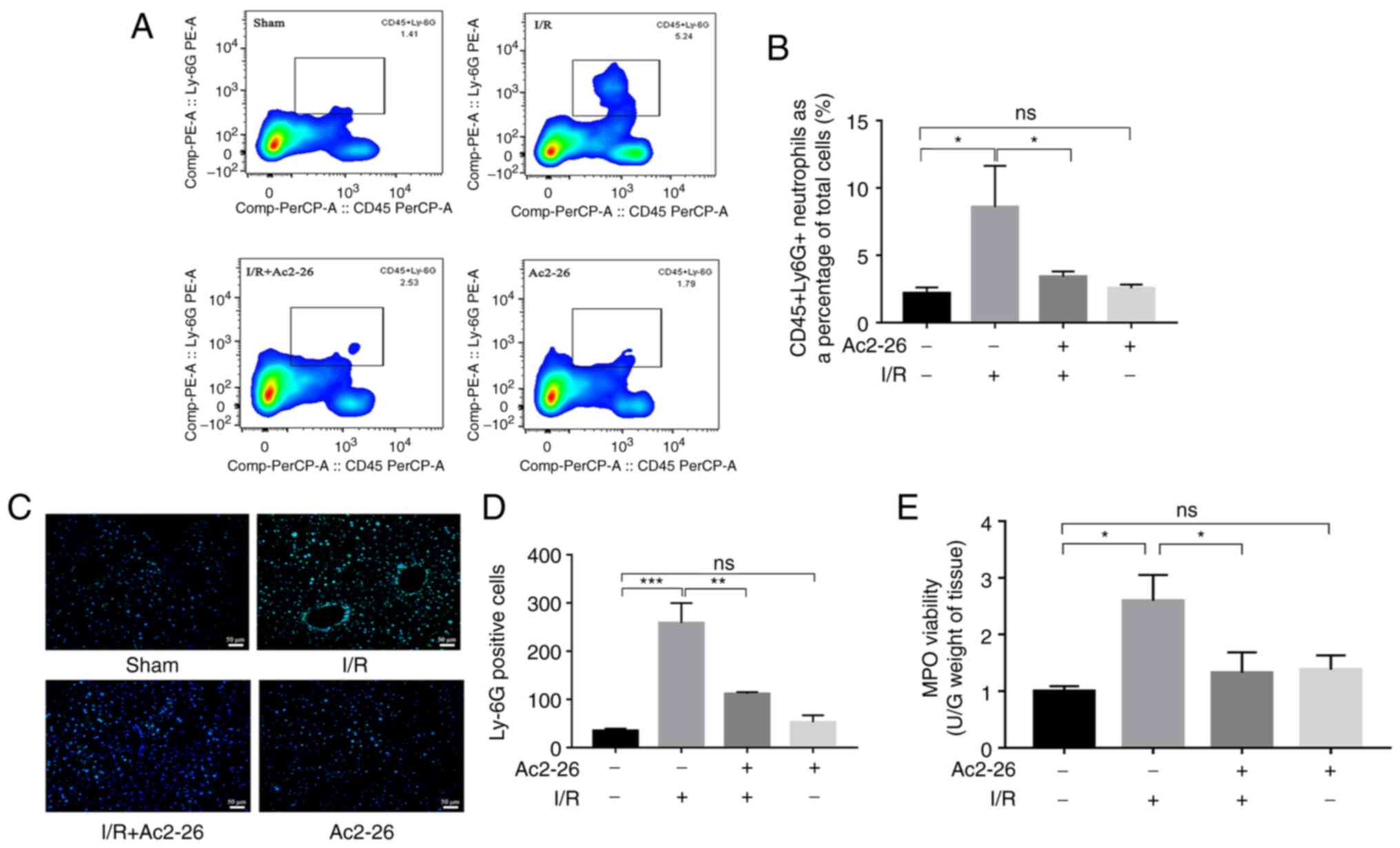To investigate whether Ac2-26 could reduce neutrophil infiltration, non-parenchymal cells were collected from liver tissues and the proportions of neutrophils were measured via flow cytometry. The results showed that pretreatment with Ac2-26 significantly reduced the proportion of neutrophils in liver tissues following HIRI. To further verify the changes in neutrophil proportion during the I/R process, the Ly6G expression and MPO activity in hepatic tissues were detected via immunofluorescence staining and colorimetry, respectively. The results demonstrated that Ac2-26 markedly reduced the HIRI-induced increase in Ly6G-positive neutrophil infiltration as well as MPO activity. These results suggested that Ac2-26 could inhibit HIRI-induced neutrophil infiltration, thereby reducing the inflammatory response.