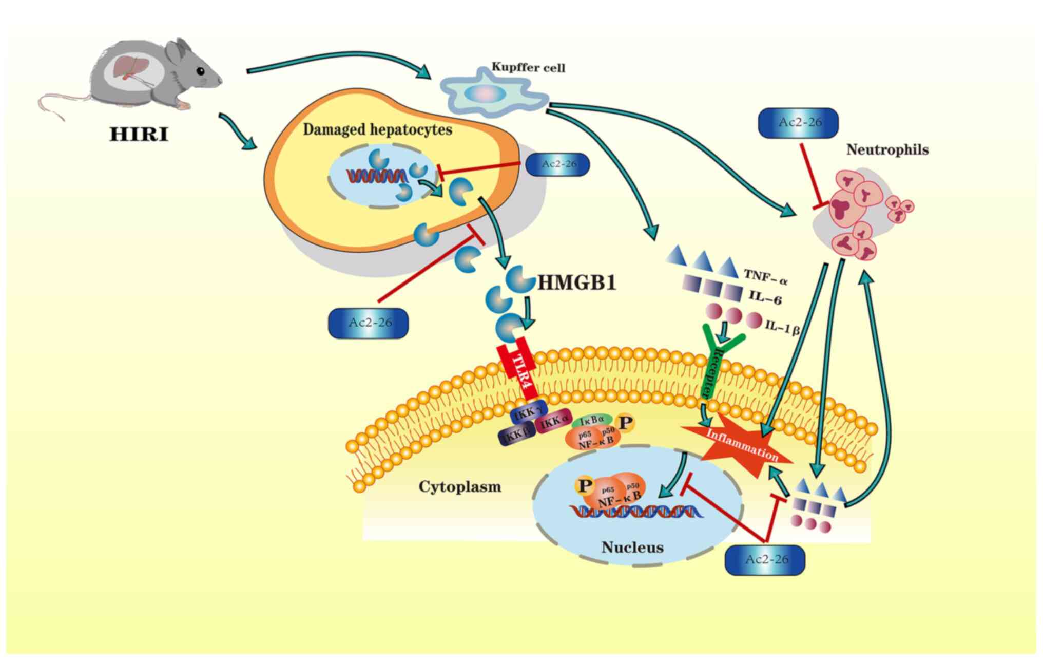 In summary, the results of the present study demonstrated that the HMGB1/TLR4/NF-κB/neutrophil axis may participate in the development of HIRI. In order to illustrate the molecular mechanisms of hepatoprotection by Ac2-26, the attendant changes in the expression of HMGB1, TLR4 and NF-κB, as well as neutrophil proportion, were investigated. The results demonstrated that Ac2-26 could ameliorate the hepatic damage associated with HIRI via the HMGB1/TLR4/NF-κB signaling pathway while inhibiting neutrophil infiltration. A schematic illustration of the proposed molecular mechanisms responsible for Ac2-26 hepatoprotection is given in Fig. 6. The findings of the present study may help to identify an effective targeted therapy for the treatment of HIRI and improve the prognosis of patients. In the future, ‘anti-neutrophil’ interventions or HMGB1 antagonists should be further investigated. However, the present study has certain limitations, including the fact that the level of Ac2-26 in serum and liver samples upon systemic administration was not determined. Future research should be conducted in order to explore the pharmacological mechanisms and metabolism of Ac2-26.