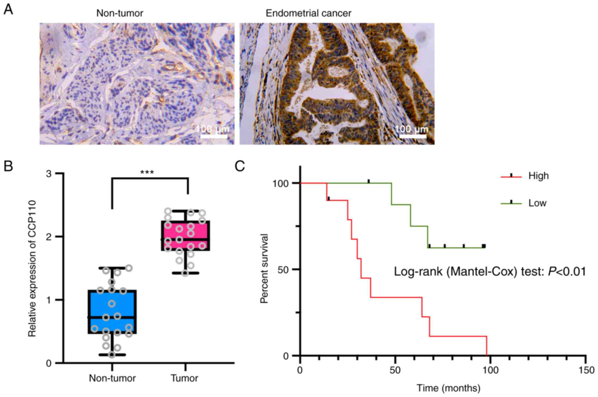 For IHC assay, tissue sections (5-µm) were deparaffined, rehydrated, and incubated for 1 h at 80˚C in citrate buffer (10 mM; pH 6.0) with 0.05% Tween 20 for antigen retrieval. After saturation for 30 min with 1% BSA (cat. no. #ST023-50g; Beyotime Institute of Biotechnology) in PBS at room temperature, the sections were incubated with CCP110 antibody (1:1,000; cat. no. ab99337; Abcam) overnight at 4˚C, followed by incubation with biotin-linked anti-rabbit IgG (cat. no. #E043201-6; 1:1,000; Agilent Technologies, Inc.) for 1 h at room temperature and then with the ABC complex (cat. no. #ab8647; Abcam) at 37˚C for 20 min. IHC scores were determined as follows: Cells with <10% staining were scored as negative staining (-, 1); 10-49% staining as (+, 2); 50-74% staining as (++, 3); 75-100% staining as (+++, 4). The staining color was scored as light-yellow particle (score 1), brown-yellow particle (score 2) and brown particle (score 3). Number score times the color score was used as the final score (41). A score value ≤5 was grouped as low expression, while a score >5 was grouped as high expression.