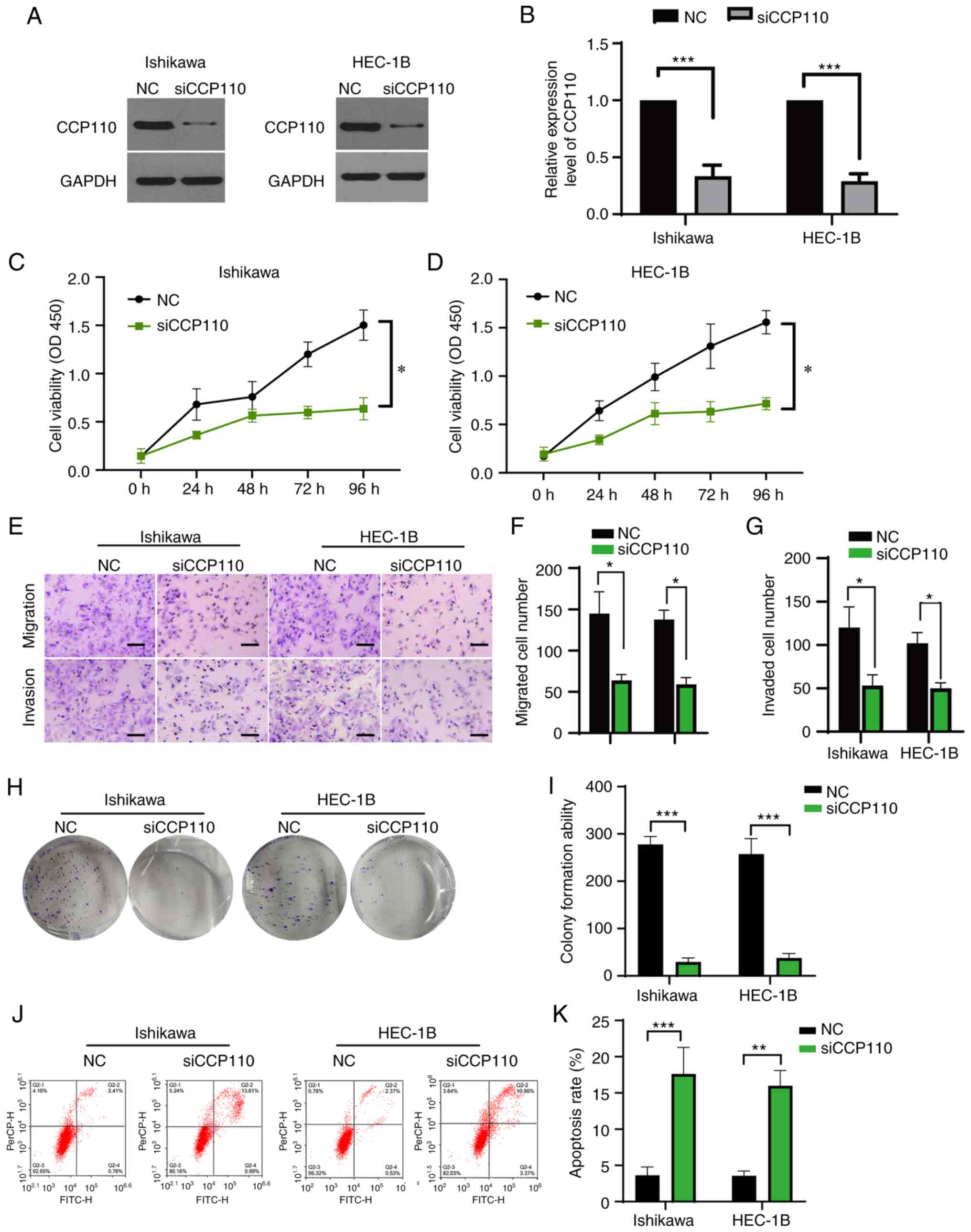 To examine the role of CCP110 in EC further, the Ishikawa and HEC-1B EC cell lines were transfected with a NC siRNA or a siRNA targeting CCP110 (siCCP110). The expression of the protein was measured using western blotting. Compared with the NC, treatment of both cell lines with siCCP110 inhibited expression of the CCP110 protein significantly (Fig. 2A and B and Fig. S1). CCK-8 and Transwell assays showed that knockdown of CCP110 significantly suppressed the proliferation, migration and invasion of both cell lines (Fig. 2C-G). In addition, a colony formation assay revealed that treatment with siCCP110 significantly inhibited the colony formation ability of both cell lines (Fig. 2H and I). Next, flow cytometry assay was used to examine apoptosis, which revealed that silencing of CCP110 significantly upregulated the apoptosis rate in both cell lines (Fig. 2J and K). Overall, these results indicated that genetic knockdown of CCP110 induced apoptosis and suppressed the growth, migration and invasion of EC cells.