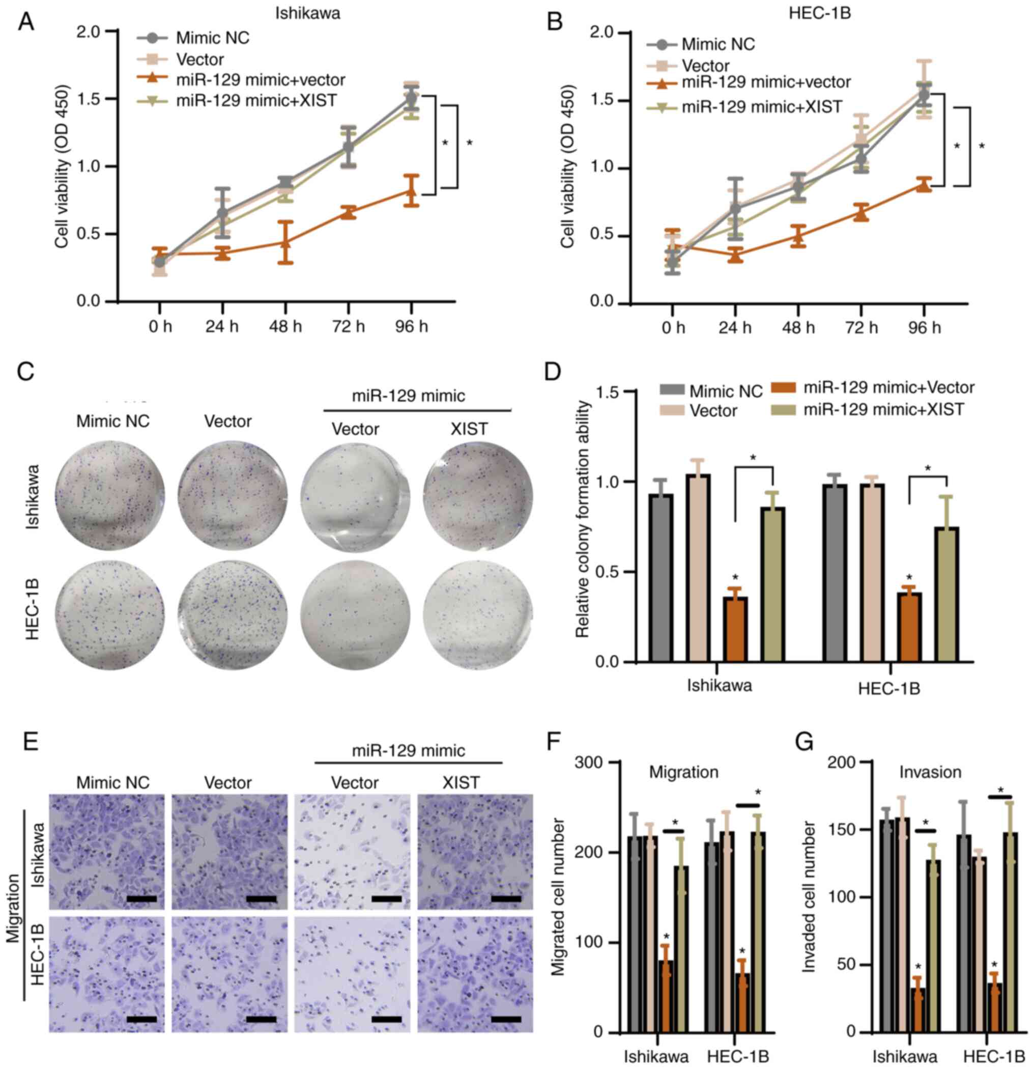 To examine the role of the lncRNA XIST/miR-129-2-3p axis in EC further, Ishikawa and HEC-1B cells were transfected with vector only, a NC mimic, a miR-129-2-3p mimic + vector or a miR-129-2-3p mimic + XIST vector. The expression levels of XIST by overexpression of pcDNA3.1-XIST encoding plasmids in two cell lines were verified using RT-qPCR and shown in Fig. S4A. A CCK-8 assay showed that the miR-129-2-3p mimic inhibited EC cell proliferation (compared to the vector group), while overexpression of XIST antagonized this effect in both cell lines (Fig. 5A and B). Furthermore, in both cell lines, overexpression of XIST significantly antagonized the miR-129-2-3p mimic-induced inhibition of cell colony formation (Fig. 5C and D) and migration and invasion ability (Figs. 5E-G and S4). These data suggested that the lncRNA XIST functions via miR-129-2-3p to regulate the proliferation, migration and invasion of EC cells.