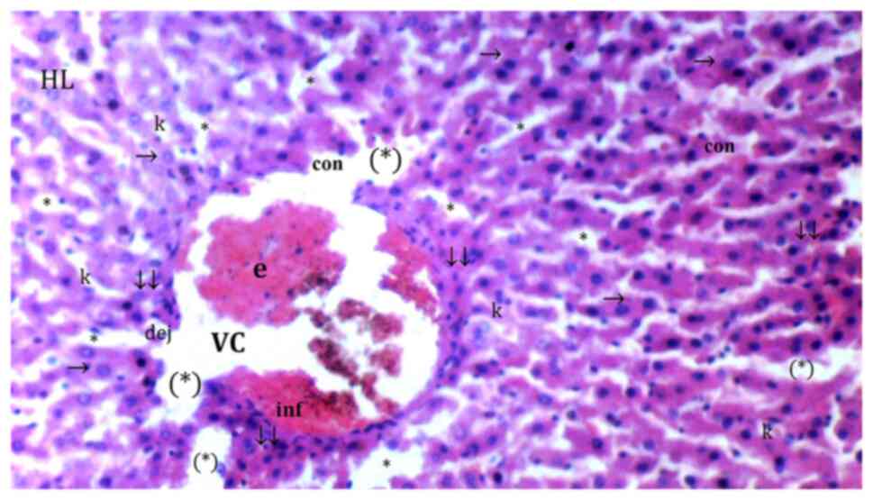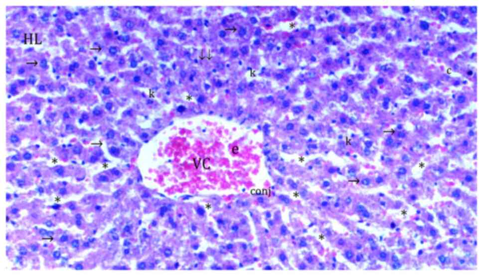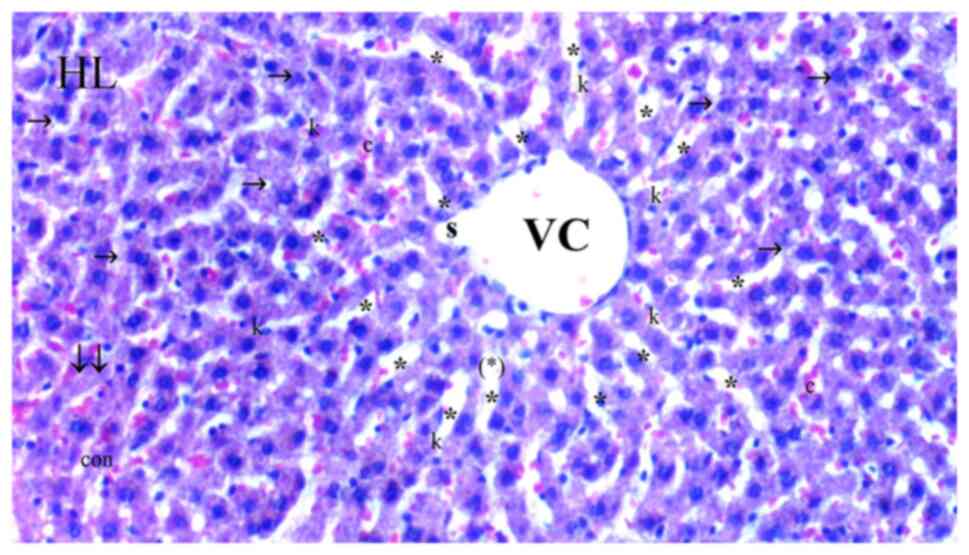 Each preparation was examined for hepatocyte degeneration, sinusoidal dilatation, pre-necrotic cell and mononuclear cellular infiltration in the parenchyma. Histological testing semiquantitative evaluation technique used by Abdel-Wahhab et al (25) was applied for interpreting the structural changes in hepatic tissues of control and treatment groups. According to this, a negative point (0) represents no structural changes; one positive point (1,+) indicates mild changes; two positive points (2,++) represent medium structural changes and three positive points (3,+++) indicate severe structural changes.