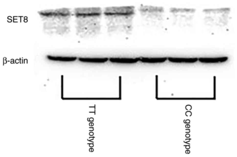 Western blotting was performed to confirm the association between SET8 expression and SNPs rs16917496. Total protein was isolated from human peripheral blood mononuclear cells using a ReadyPrep protein extraction kit (Bio-Rad Laboratories, Inc.) according to the manufacturer's instructions. BCA assay was used to determine protein concentration. A total of 40 µg total protein/lane was loaded in a 10% denaturing polyacrylamide gel for separation and transferred to polyvinylidene difluoride membranes. The membranes were blocked using 5% skimmed milk powder with TBST containing 0.1% Tween-20 for 1 h at room temperature, then incubated at 4˚C overnight with the following primary antibodies: Mouse monoclonal anti-SET8 (Abcam; cat. no. ab3798; 1:500) or anti-β-actin antibody (Santa Cruz Biotechnology, Inc.; cat. no. SC-47778A; 1:20,000). The membranes were incubated with horseradish peroxidase-conjugated anti-mouse IgG secondary antibody (Thermo Fisher Scientific, Inc.; cat. no. 31430, 1:10,000) at room temperature for 2 h. FluorChem HD2 (ProteinSimple) was used to detect signals.