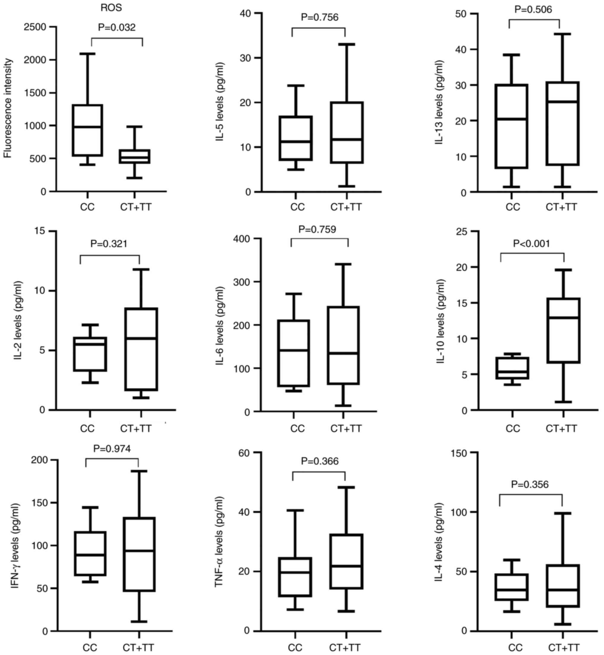 In previous studies, increased ROS levels have been reported in patients with RA (24,25); therefore, the present study investigated the relationship between SNP rs16917496 and ROS levels in patients with RA. ROS levels were higher in the CC genotype carriers (1011.500±536.426 vs. 548.616±190.508, P=0.032, Fig. 2) than in the CT + TT genotype carriers. CC genotype was significantly associated with lower IL-10 levels (P<0.001; Fig. 2). These data suggested that SNPs regulated RA development by mediating ROS production and cytokine expression. There was no significant association between SNP rs16917496 and clinical characteristics of the participants, including age, sex, levels of anti-CCP and CRP, ESR, RF levels and DAS28 (data not shown).
