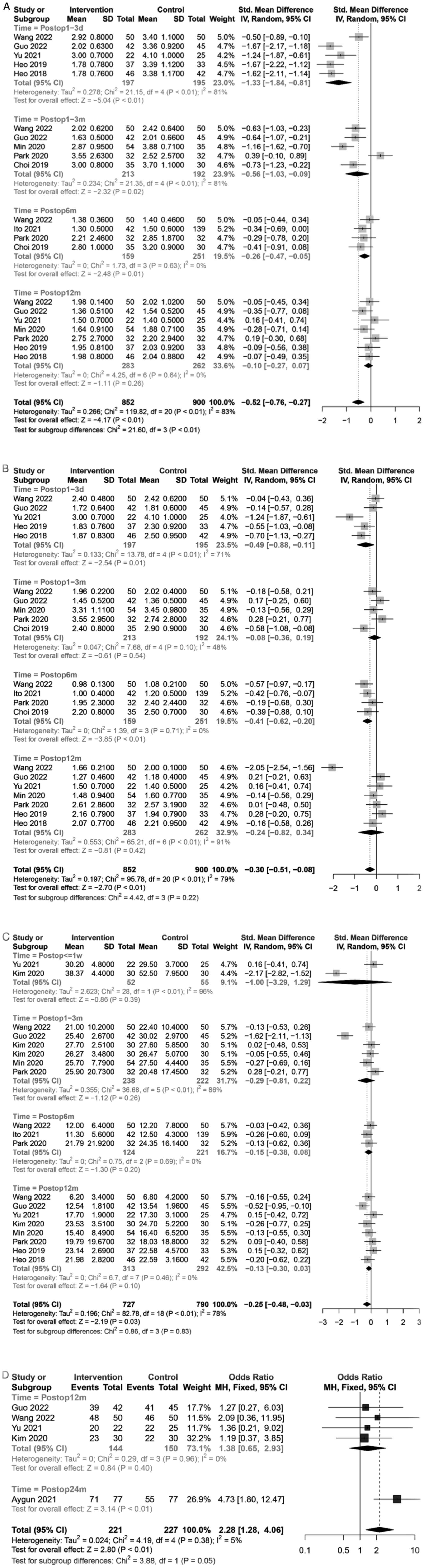 The present study has some limitations. First, it included primarily Korean and Chinese studies, and this is not reflective of surgical procedures in other countries around the world. Each subgroup had a smaller sample size in the subgroup analysis and may not be sufficient in power to reflect the real-world scenario. Second, a publication bias exists since small-scale studies are prone to remain unpublished, which could account for language limitations in the inclusion criteria or selective publication. Third, in this study, four RCTs were included, whereas the rest of the studies were CSs. Since it is difficult to completely apply randomized and blinded controls in practice, observational studies were included, which limited the quality of the literature included. In certain studies, only descriptive analyses were performed, precluding accurate clinical data extraction. The use of different surgical procedures can also lead to bias. Finally, the absence of ethical approvals may have affected data analysis, causing inevitable bias. Therefore, the conclusions of this study need to be further verified using a large sample prospective RCT. It is important to note that this evaluation was based on a small number of studies; therefore, caution should be exercised when interpreting and extrapolating the results.