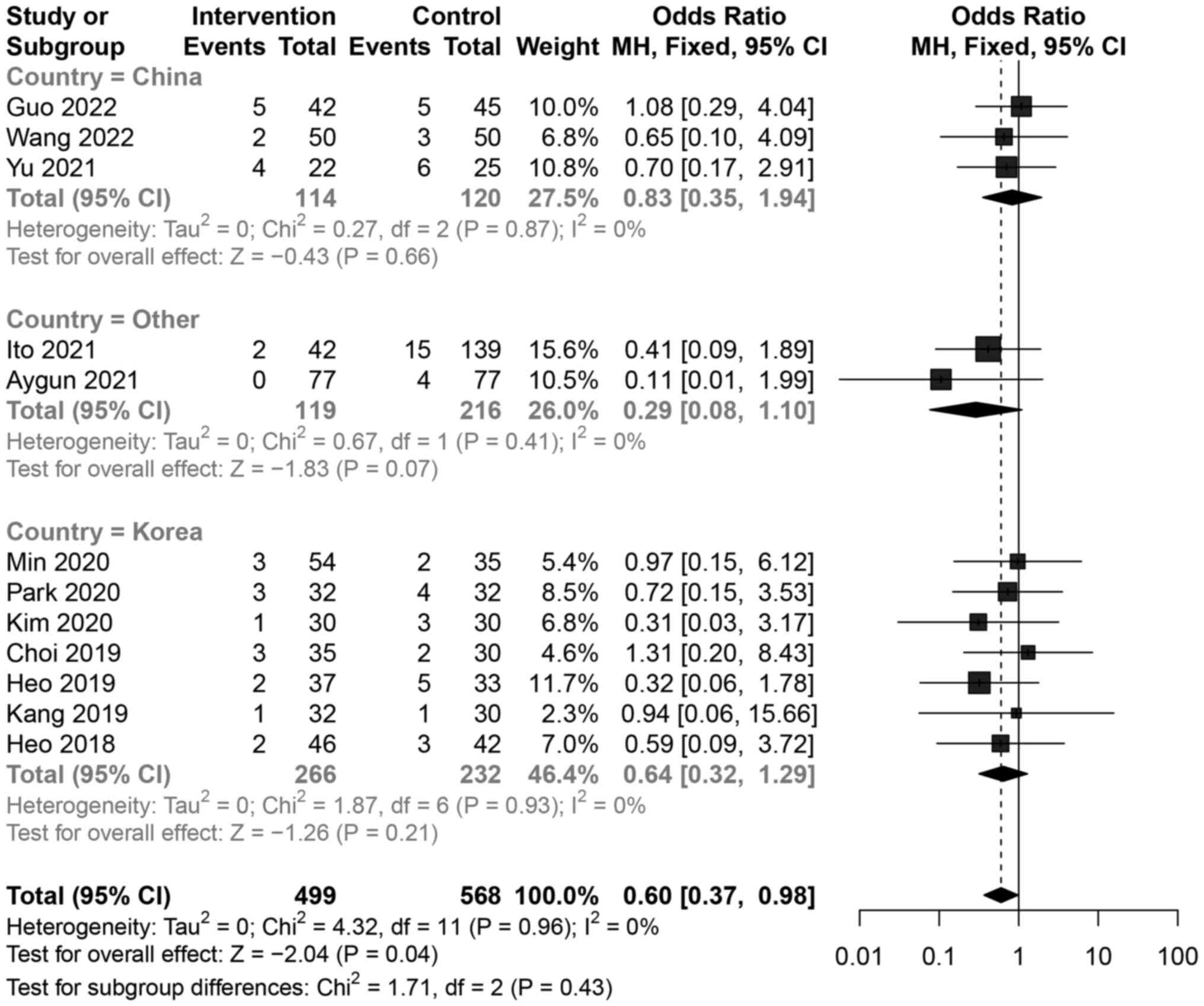 All 12 studies (15-26) presented the complication data. The total meta-analysis revealed that the UBE group had fewer complications than those in the MD group [SMD=-0.60, 95% CI (0.37, 0.68), P=0.04]. Country-based subgroup analysis showed no significant differences between the UBE and MD groups in China [SMD=-0.83, 95% CI (0.35, 1.94), P=0.66], Korea [SMD=0.64, 95% CI (0.32, 1.29), P=0.21], and the other two countries [SMD=0.29,95% CI (0.08, 1.10), P=0.07] (Fig. 4). In terms of overall data, the complications of UBE were lower than that of the MD group. This reduces the patient's pain and greatly reduced the financial burden of dealing with complications.