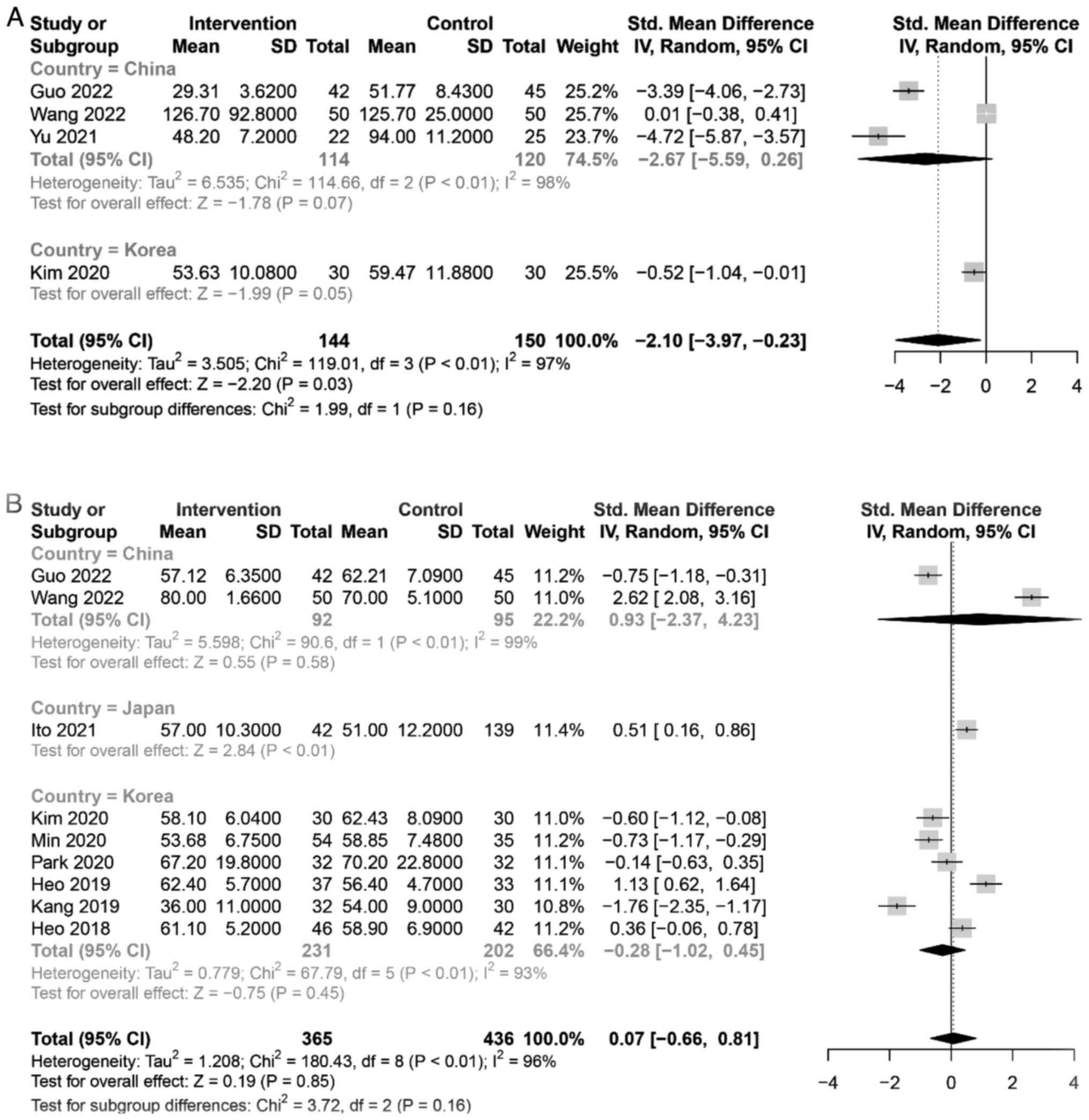Data analysis was implemented using the R version 4.1.3 R Core Team (http://www.R-project.org/). Binomial variables were analysed by calculating the odds ratios (OR) and 95% confidence intervals (CI). For continuous variables, the standardized mean difference (SMD) and 95% CI for analysis were used. Heterogeneity was assessed using I2 statistics, and a random effects model was chosen when heterogeneity was significant (I2>50%); otherwise, a fixed-effects model was selected. Publication bias was assessed for outcomes in >10 included studies using funnel plots.