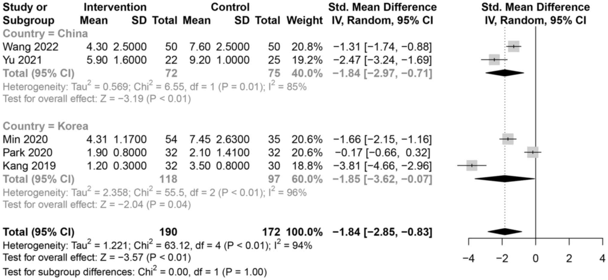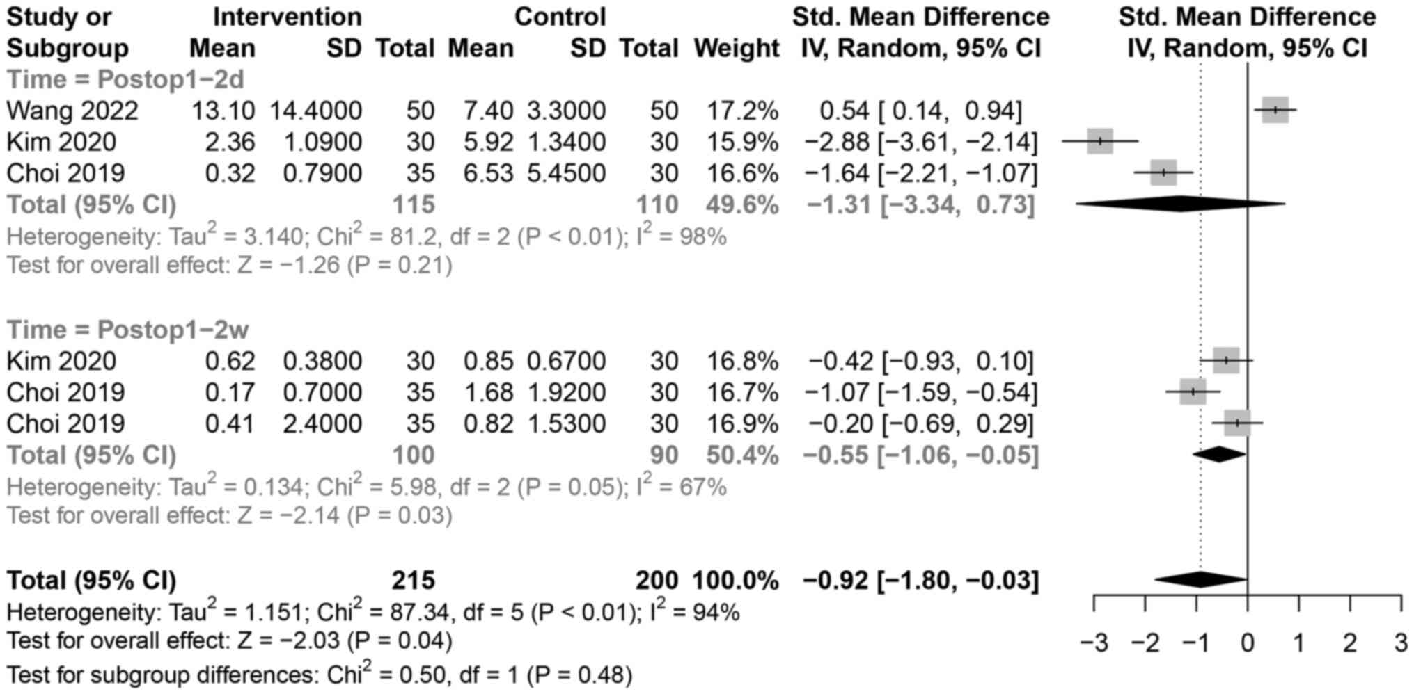 A total of five studies (16,17,21,22,25) presented hospital stay data. Hospital stays were shorter in the UBE group than those in the MD group [SMD=-1.84, 95% CI (-2.85, -0.83), P<0.01]. Country-based subgroup analysis revealed shorter hospital stays in the UBE group than that in the MD group in China [SMD=-1.84, 95% CI (-2.97, -0.71), P<0.01) and Korea [SMD=-1.85, 95% CI (-3.62, -0.07), P=0.04, (Fig. 6)]. In terms of overall data, the patients staying in the hospital in the UBE group was shorter than that of MD, so UBE could relieve the patient's pain that would otherwise require long-term hospitalization. A total of three studies (16,20,23) presented CRP data. The meta-analysis showed that the postoperative CRP levels were lower in the UBE group than those in the MD group [SMD=-0.92, 95% CI (-1.80, -0.03), P=0.04]. Follow-up time-based subgroup analysis showed that the postoperative CRP levels in the UBE group were lower than those in the MD group in the 1-2-week time point [SMD=-0.55, 95% CI (-1.06, -0.05), P=0.03], with no significant difference at 1-2 days after the operation [SMD=-1.31, 95% CI (-3.34, 0.73), P=0.21, (Fig. 7). In terms of overall data, the postoperative CRP levels in the UBE were lower than that in the MD group.