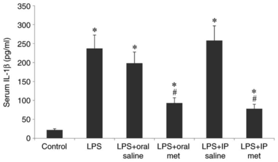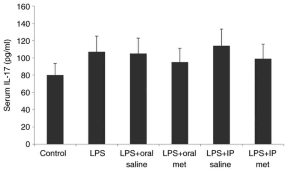 The present study demonstrated a non-significant increase in serum IL-17 levels in mice pretreated with LPS. Neither IP nor oral metformin had a significant effect on serum IL-17 levels. One possible explanation for these findings is that the effect of LPS is likely to be dose- or time-dependent. Sun et al (40) reported that IL-17A is upregulated in LPS-induced neuroinflammation and cognitive impairment in aged rats. Differences in the findings of the present study regarding IL-17 levels could be due to the time frame of sample collection following LPS injection. It could be possible that 1 h may not be sufficient time to demonstrate a significant increase in serum IL-17 levels. A previous study reported that whilst IL-6 and TNF-α levels peak within 1 h of LPS injection in mice, changes in IL-17 levels are slower and peak over 8 h (41).