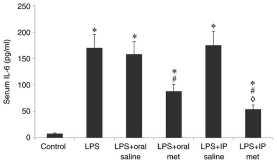 The present study demonstrated that LPS injection resulted in a significant increase in serum IL-6 levels in all treatment groups of animals tested. Pretreatment with either oral or IP metformin significantly reduced this increase in IL-6 levels. IP metformin was significantly more effective at reducing IL-6 levels compared with oral metformin. Hyun et al (38) reported that metformin reduces IL-1, IL-6 and TNF-α production at both the protein and mRNA level in a dose-dependent manner. Similarly, Chao et al (36) reported that metformin reduces the LPS-induced release of IL-6 in mouse livers. Additionally, metformin inhibits the acute inflammatory response in two macrophage-like cell lines by activating AMPK, but not HIF-1 or IL-10(39).