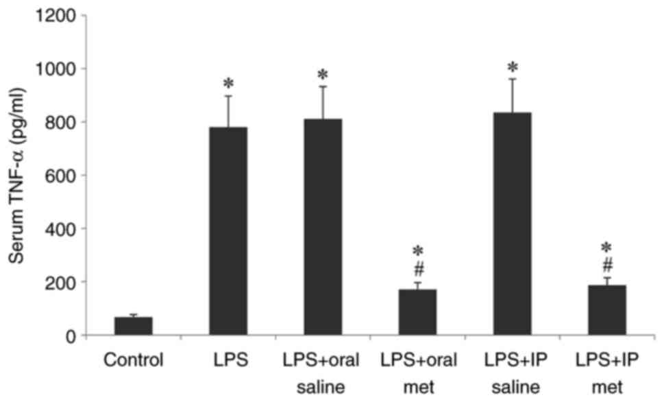 TNF-α is an inflammatory cytokine produced in response to bacterial and viral infections and can elicit tissue damage and fibrosis (27). The present study demonstrated that serum TNF-α levels were significantly increased after mice were injected with LPS compared with the controls. Oral or IP metformin were equally effective in attenuating the significantly elevated TNF-α levels, with no significant differences demonstrated between either route of administration. Kim et al (30) previously reported that oral administration of metformin to mice treated with LPS reduced the plasma, spleen and lungs tissue levels of both TNF-α and IL-6 leading to a reduction in the effect of LPS-induced inflammation.