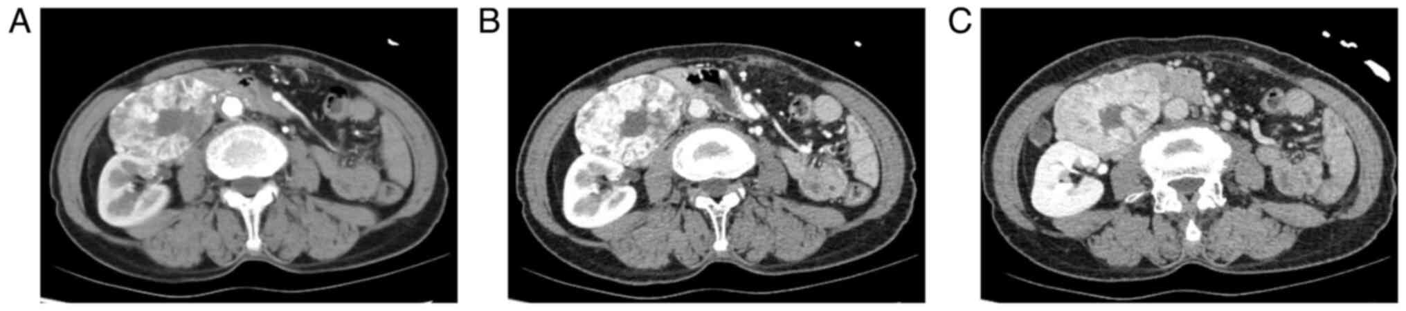 After admission, the patient underwent relevant examinations. Abnormalities were not found in routine blood and biochemical examinations. Other laboratory examinations showed that the level of carcinoembryonic antigen was 7.33 ng/ml (reference value 0-3.4 ng/ml), aldosterone was 52.81 pg/ml (reference value 70-300), methoxyepinephrine was 265.7 pg/ml (reference value 0-145 pg/ml) and norepinephrine was 212.8 pg/ml (reference value 217-1109 pg/ml). On a CT scan of the whole abdomen, a mass-like soft tissue shadow was seen in the lower part of the gallbladder fossa with a clear boundary, measuring ~6.5x5.4x6.6 cm. A low-density area and punctate high-density shadow were seen in the mass against the adjacent tissue, and the partial lesions were close to the intestinal tract. (Fig. 1) On whole abdominal CT enhancement, irregular masses of soft tissue with a clear boundary were seen in the front of the kidney on the right abdomen, and the size was ~6.5x5.4x6.6 cm. On the contrast-enhanced CT scan, the lesions were obviously enhanced inhomogeneously, and there were low-density areas and punctate high-density shadows in the lesions without enhancement. Large vessels were observed in the inside and edge of the lesion, which pushed against the descending and horizontal parts of the duodenum. The anterior margin of the right kidney, the head of the pancreas and the uncinate process were compressed, and the systems of the pancreatic duct and bile duct were slightly dilated.