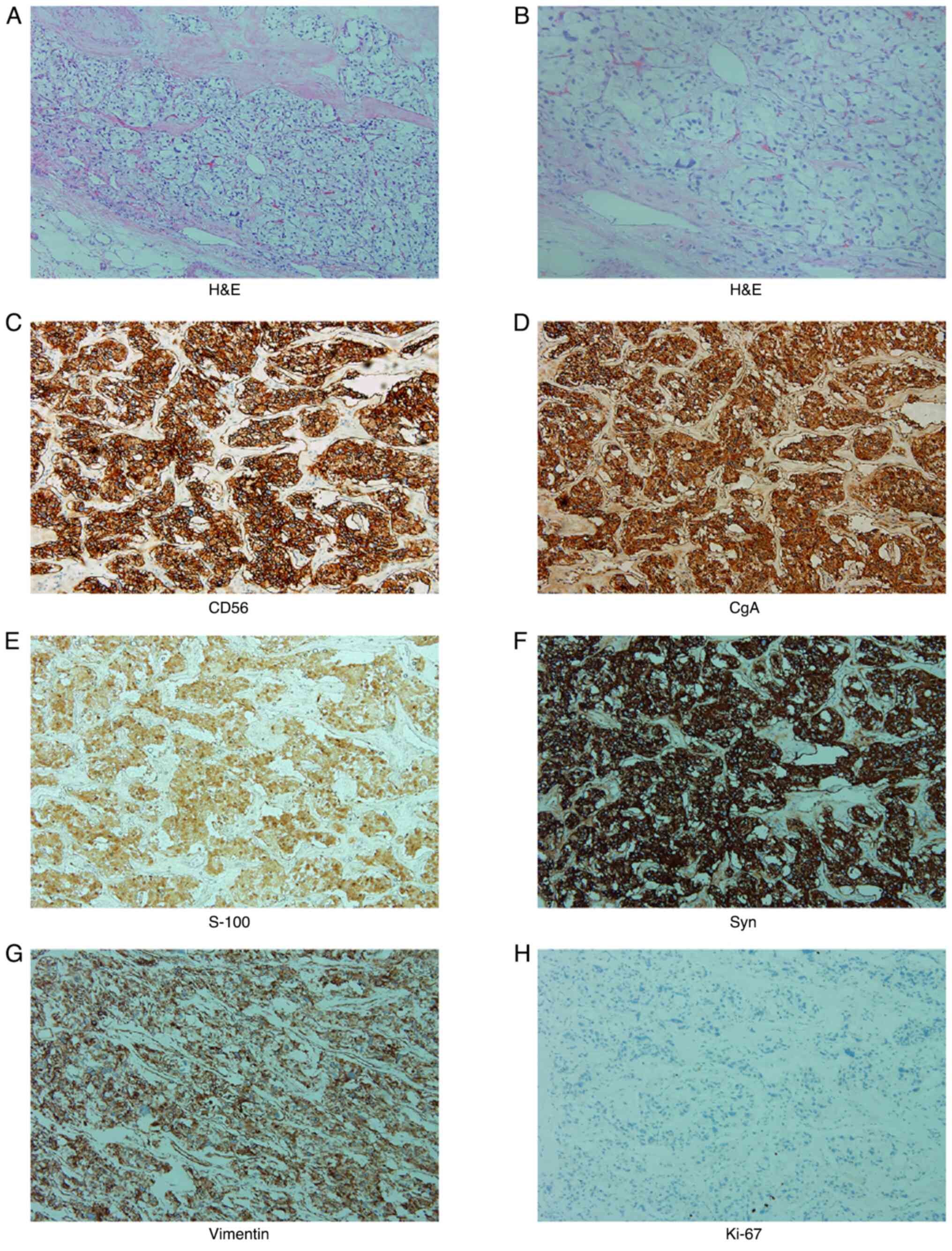 After oral administration of phenoxybenzamine and intravenous infusion for 1 week, the present study performed the elective operation of laparoscopic exploration. After inserting the laparoscope, there were no obvious abnormalities observed in the stomach, small intestine, colon, peritoneum or pelvic cavity. Then, the lateral membrane of the duodenum was opened and a tumour with a hard texture and clear boundary was visible in the back of the pancreas, the abdominal aorta and the anterior part of the inferior vena cava. During the operation, removal of the tumour was attempted. Because the base of the tumour was closely involved with the abdominal aortic sheath and it was difficult to turn completely freely under the laparoscope, we decided to perform open surgery. A longitudinal incision around the umbilicus ~20 cm long was made in the upper abdomen and continued to expose the retroperitoneal tumour. Since the right margin of the tumour was free and the peritoneum of the duodenum was fully opened, we disconnected the tumour from the inferior vena cava after breaking off two branches of the venous reflux. We further severed the connection between the tumour, the abdominal aortic sheath and the tumour basilar artery. The retroperitoneal tumour was resected. Postoperative pathology showed that the surface of the grey-white and grey-red nodular tumour with a volume of 8.5x7x4.5 cm was completely encapsulated. The tangential section of the tumour was greyish red with a soft texture, and another section was greyish white with a hard texture. Then immunohistochemistry was performed on the tumour tissue. The immunohistochemistry protocol included the following indicators: Synaptophysin (Syn), Chromogranin A (CgA), CD56, S-100, epithelial membrane antigen (EMA), cytokeratin (CK), Vimentin, Melan-A, paired box 8 (PAX-8) and Ki-67. Immunohistochemical staining used the following primary antibodies (ZSGB-Bio): Anti-Syn (cat. no. ZM0246), anti-CgA (cat. no. ZM0076), anti-CD-56 (cat. no. ZM0057), anti-S-100 (cat. no. ZM0224), anti-EMA (cat. no. ZM0095), anti-CK (cat. no. ZM0067), anti-Vimentin (cat. no. ZM0260), anti-Melan-A (cat. no. ZM0398), anti-PAX-8 (cat. no. ZM0468) and anti-Ki-67 (cat. no. ZM0167). The following are details of the immunohistochemistry: Tissues were embedded after fixing with 4% paraformaldehyde at room temperature for 48 h and the thickness of sections was ~5-µm. Peroxidase was inactivated by incubating sections with 3% H2O2 for 10 min at room temperature. Normal goat serum working fluid (cat. no. ZLI9022; OriGene Technologies, Inc.) was used to incubate the sections for 15 min at room temperature. Subsequently, the aforementioned primary antibodies were used at a dilution of 1:100 and incubated at 4˚C for 12 h. Next, the sections were incubated with biotin-labelled goat anti-mouse/rabbit IgG secondary antibodies (ZSGB-Bio; cat. no. SAP-9100) at a dilution of 1:500 for 30 min at room temperature. After, images were captured using a fluorescent microscope. The results of H&E staining are shown in Fig. 2A and B. The immunohistochemistry results were as follows: Syn(+), CgA(+), CD56(+), Vimentin(+), S-100(+), the proliferation index of Ki-67 was ~1% and the others were negative (Fig. 2C-H).
