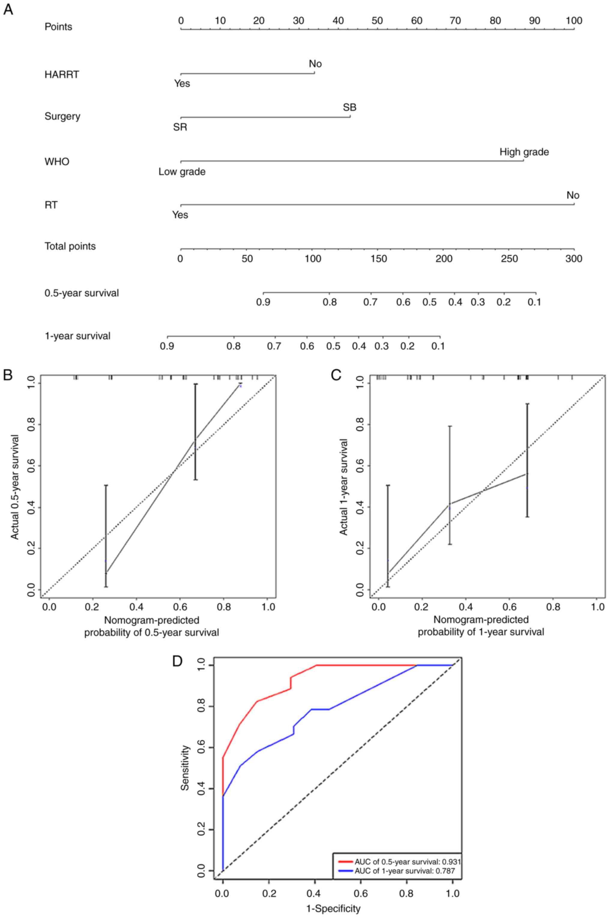 A nomogram (Fig. 4A) for predicting the 0.5- and 1-year survival rates of such patients was established based on HAART (no/yes), surgery (SB/SR), RT (no/yes) and WHO grade (low-grade/high-grade). The nomogram had a high C-index of 0.774 (95% CI, 0.703-0.845) for assessment of the predictive model. Calibration plots and receiver operating characteristic curves for the nomogram model were established. The calibration curves indicated that the predicted 0.5- and 1-year survival rates were consistent with the actual results in the cohort (Fig. 4B and C). The AUC value of the nomogram for 0.5-year survival was 0.931 and for 1-year survival was 0.787 (Fig. 4D), suggesting that the model had good predictive ability.
