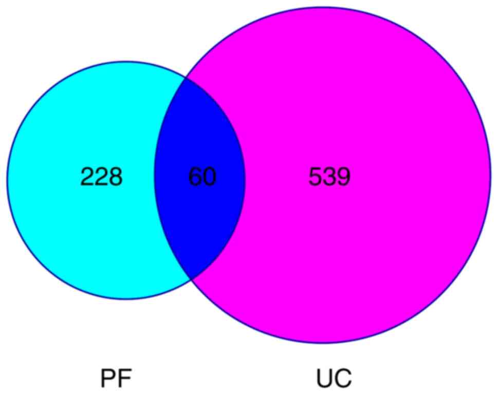 The chemical structure of PF was obtained from the PubChem database. Then the SDF file of PF was imported into the PharmMapper server (http://www.lilab-ecust.cn/pharmmapper/index.html). A total of 288 potable targets were obtained in PharmMapper with NormFit scores >0. Additionally, a total of 599 potential gene targets were obtained from the OMIM, TTD, and GeneCards databases. Common targets identified from both the active ingredient and UC-related searches were considered potential targets. A total of 60 common potential genes were screened by Venny (Fig. 1).