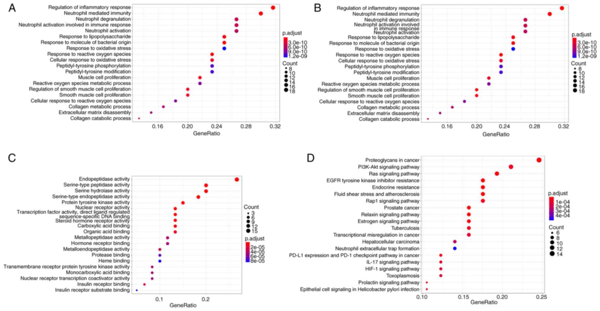 GO and KEGG pathway enrichment analyses were performed using the Metascape database and R for visualization of the 60 common target genes. In terms of MFs, treatment of UC with PF primarily involved endopeptidase activity, serine-type peptidase activity, serine hydrolase activity, nuclear receptor activity, transcription factor activity, and direct ligand-regulated sequence-specific DNA binding (Fig. 3A). The BPs primarily involved regulation of the inflammatory response, neutrophil-mediated immunity, response to reactive oxygen species, response to lipopolysaccharide, and response to molecules of bacterial origin (Fig. 3B). The CC primarily involved vesicle lumen, secretory granule lumen, cytoplasmic vesicle lumen, collagen-containing extracellular matrix, and membrane raft (Fig. 3C).