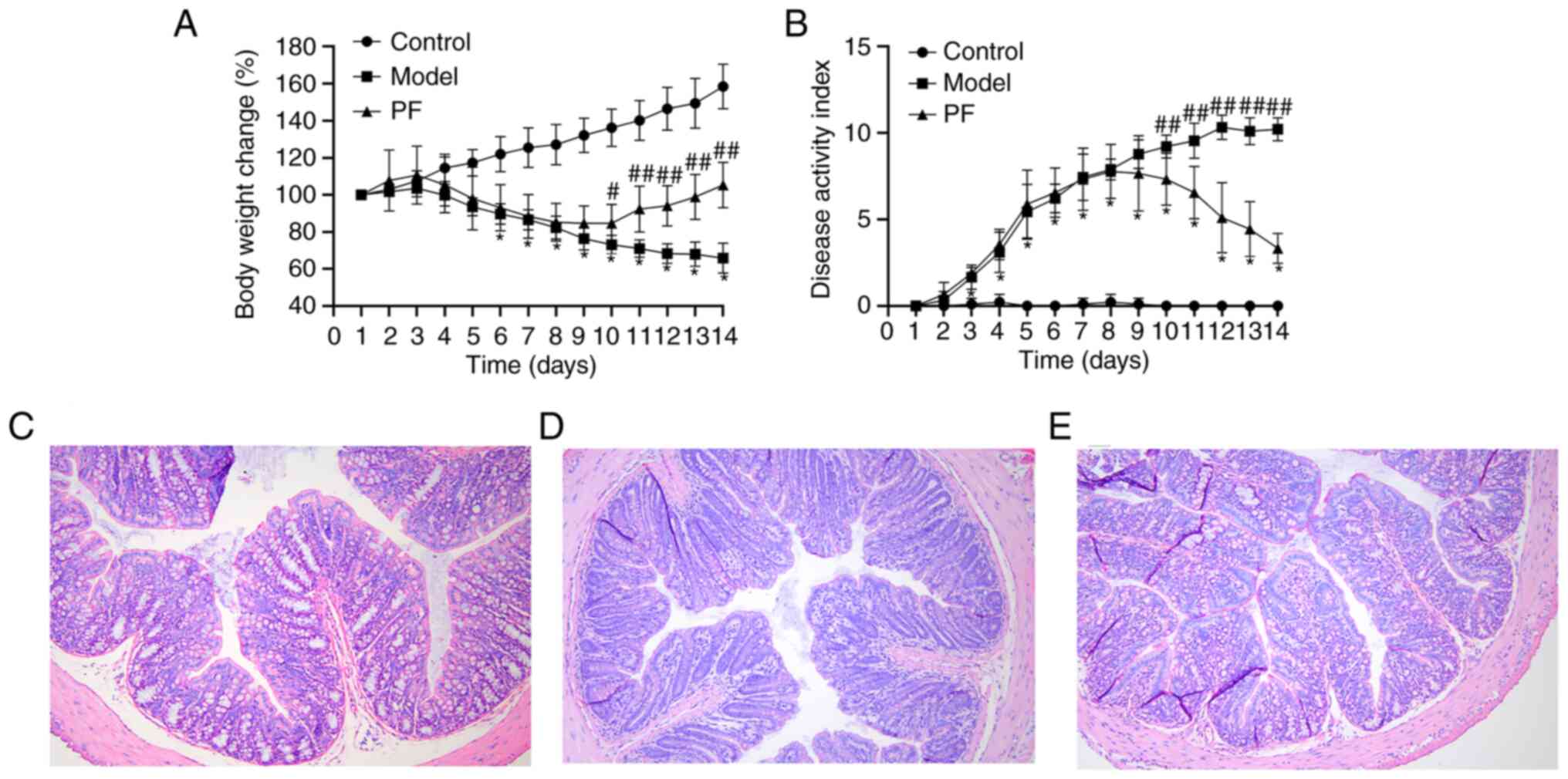 The control group showed a steady weight increase. After administration of DSS, a significant loss in the body weight of the animal was observed, and this continued until the end of the experiment in the PF group and model group compared with the control group (P<0.01, Fig. 5A). Compared with the model group, the PF-treated mice showed a significant decrease in DAI scores (P<0.01, Fig. 5B). The colonic tissue was observed by light microscopy. The histomorphology of the colonic tissue of mice in the control group appeared normal. In the model group, the colonic tissue showed colonic mucosal injury with a decrease in the number of glands and substantial inflammatory cell infiltration in the mucosa and submucosa. In the PF treatment group, these abnormalities were alleviated, the colonic mucosa was restored to the levels of the control group, and inflammatory cell infiltration and congestion were also reduced in the PF group (Fig. 5C-E).