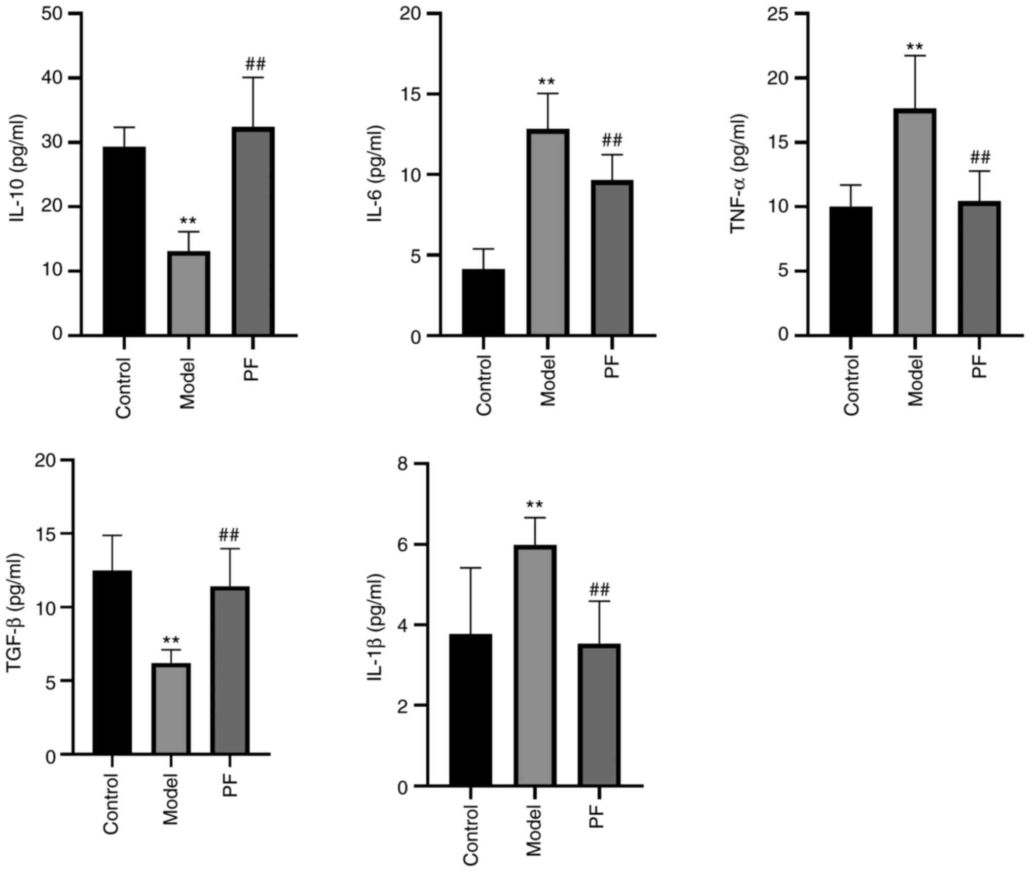 The expression levels of IL-10 and TGF-β in the model group were significantly decreased (P<0.01), while the expression levels of IL-6, TNF-α, and IL-1β were significantly increased compared with those in the control group (P<0.01). The expression levels of IL-10 and TGF-β in the PF group were significantly increased compared with those in the model group (P<0.01). The expression levels of IL-6, TNF-α, and IL-1β were significantly decreased in the PF group compared with the model group (P<0.01, Fig. 6).