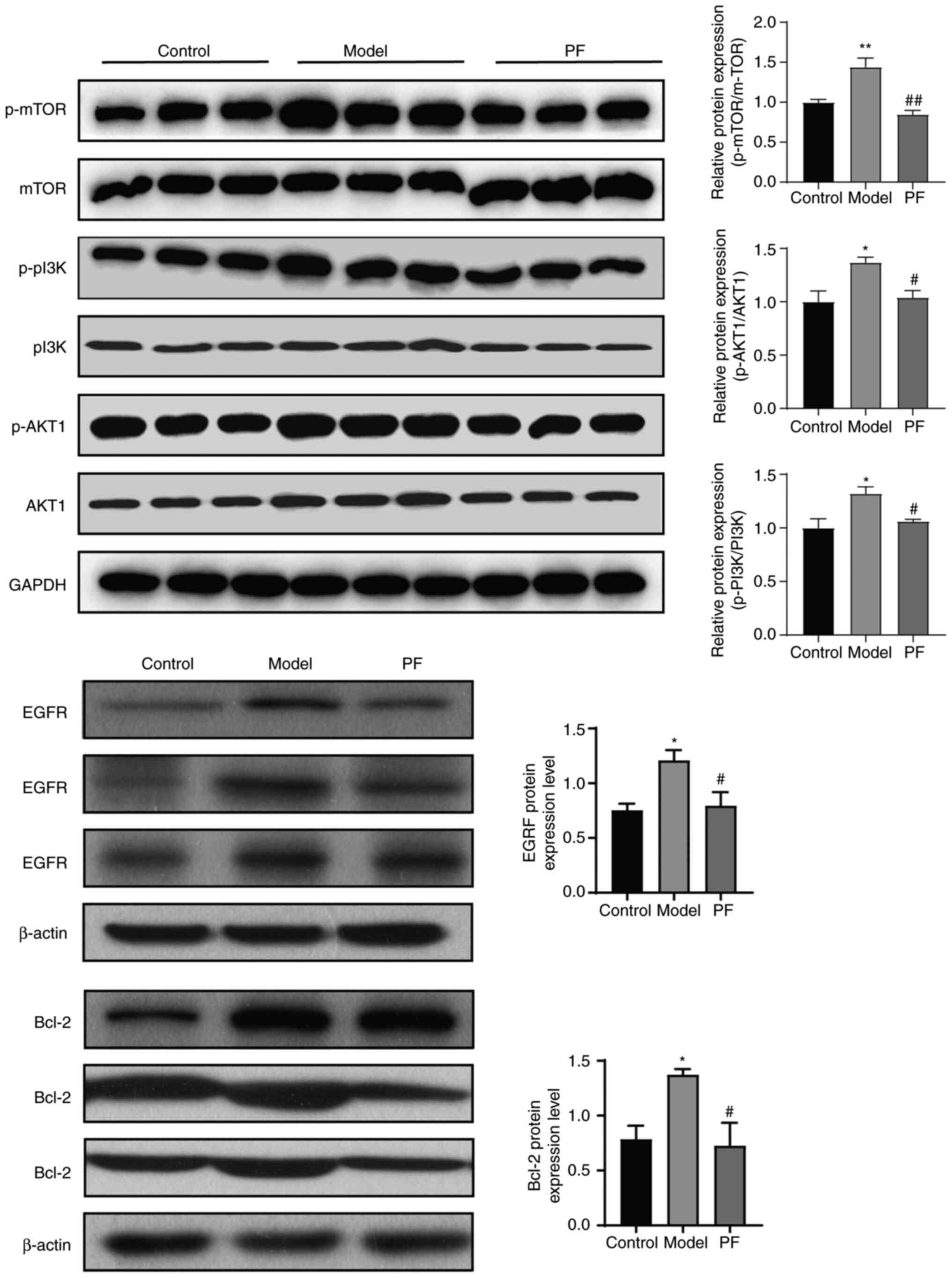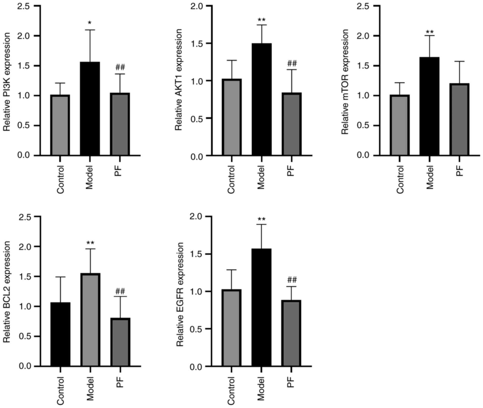 The mRNA expression levels of PI3K, AKT1, mTOR, BCL2, and EGFR were significantly increased in the model group compared with those in the control group (all P<0.05). After treatment with PF, the mRNA expression levels of PI3K, AKT1, mTOR, BCL2, and EGFR were significantly decreased compared with those in the model group (P<0.05, Fig. 7).