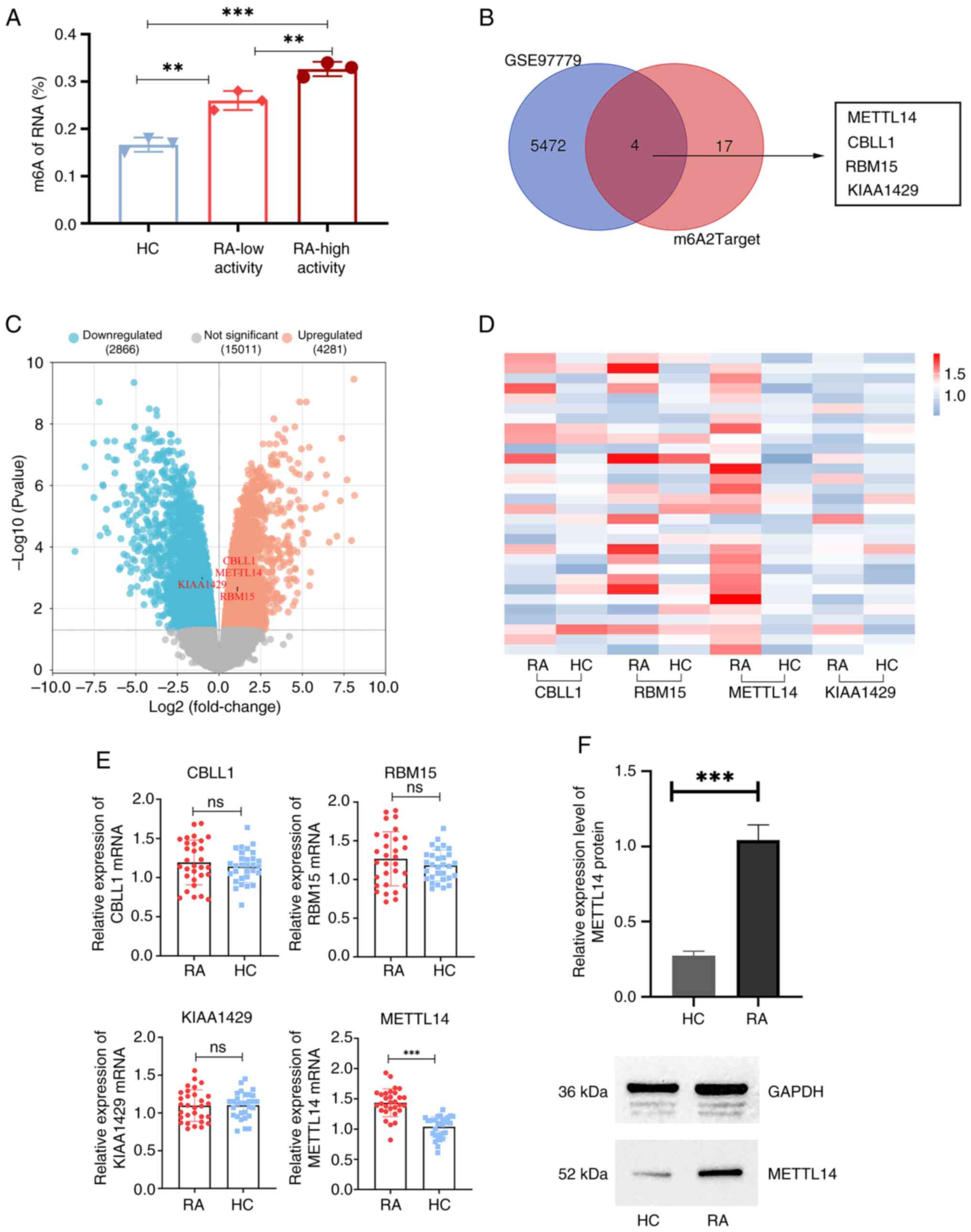 Notably, the present study has some limitations. For example, bias may be present due to the inclusion of one institution, from which the samples were obtained. In addition, in vitro and in vivo experiments were not carried out due to time constraints. Thus, future investigations should be carried out with increased sample sizes, animals and cells, to verify the involvement of METTL14 in RA macrophage polarization.