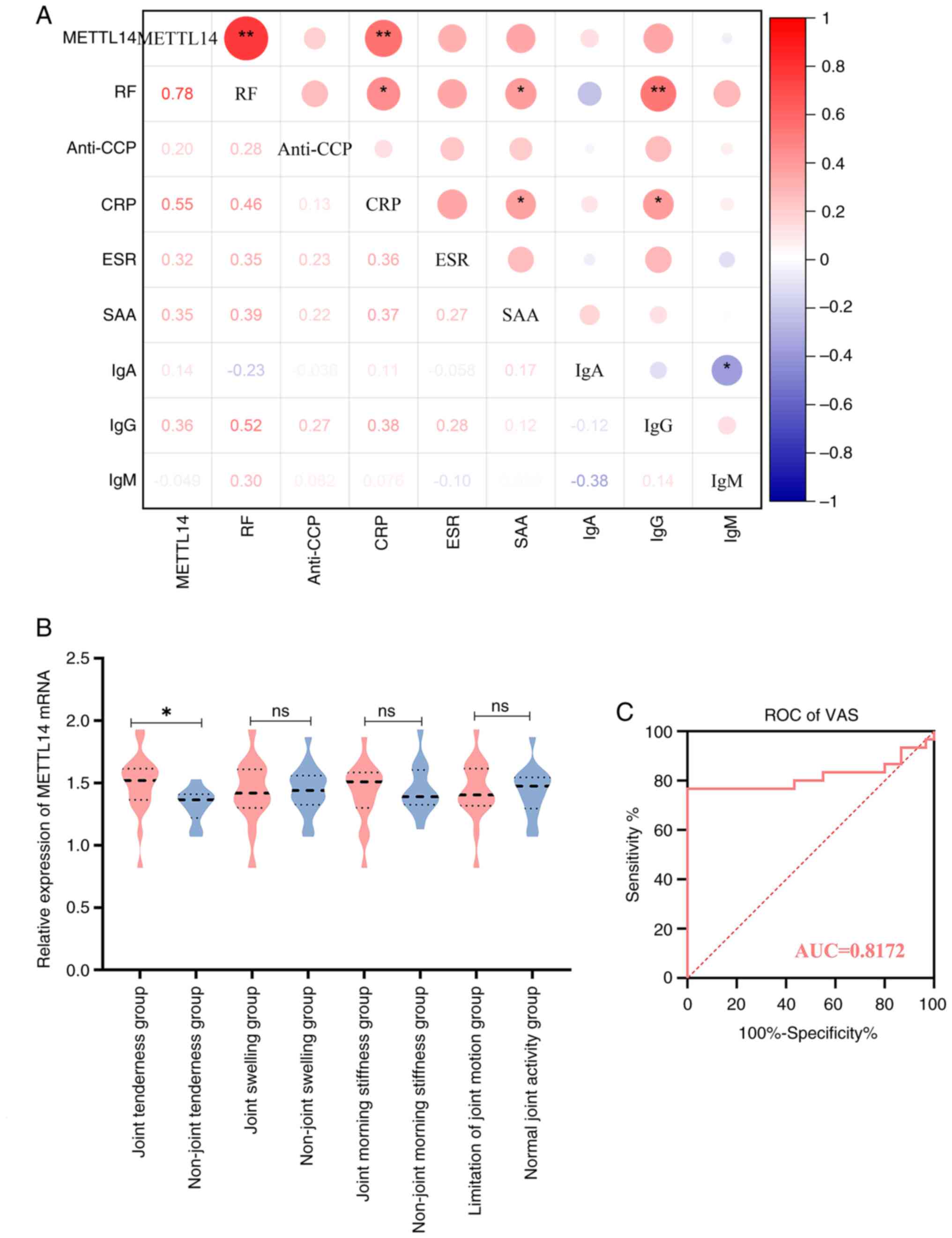The present study was approved by the Ethics Committee of The First Affiliated Hospital of Anhui University of Chinese Medicine (ethics approval no. 2019AH-12), and all patients provided written informed consent. Notably, there were no statistically significant differences in age or sex between the RA and HC groups. RA disease activity was distinguished according to the Disease Activity Score-28 (DAS28) of the patients (22). 2.6< DAS28 <5.10 indicates low disease activity, whereas DAS28 ≥5.10 indicates high disease activity. The pain perception of patients with RA was evaluated by visual analogue scale (VAS) (23). The correlation between METTL14 and clinical immunoinflammatory indicators was analyzed to determine the potential association between METTL14 and immune inflammation. The patients with RA were divided into eight subgroups according to the presence or absence of clinical symptoms. These subgroups include the joint tenderness group (20 cases), the non-joint tenderness group (10 cases), the joint swelling group (13 cases), the non-joint swelling group (17 cases), the joint morning stiffness group (17 cases), the non-joint morning stiffness group (13 cases), the limitation of joint motion group (16 cases) and the normal joint activity group (14 cases). White blood cells, red blood cells, hemoglobin, hematocrit, platelets, mean platelet volume, platelet distribution width, procalcitonin, rheumatoid factor (RF), anti-cyclic peptide containing citrulline, C-reactive protein (CRP), immunoglobulin A, immunoglobulin G (IgG), immunoglobulin M and serum amyloid A were measured using a fully automated biochemical analyzer (LTS 008AS; Hitachi, Inc.). Erythrocyte sedimentation rate was measured using an automated erythrocyte sedimentation rate analyzer (Roller 20; Alifax, Inc.).