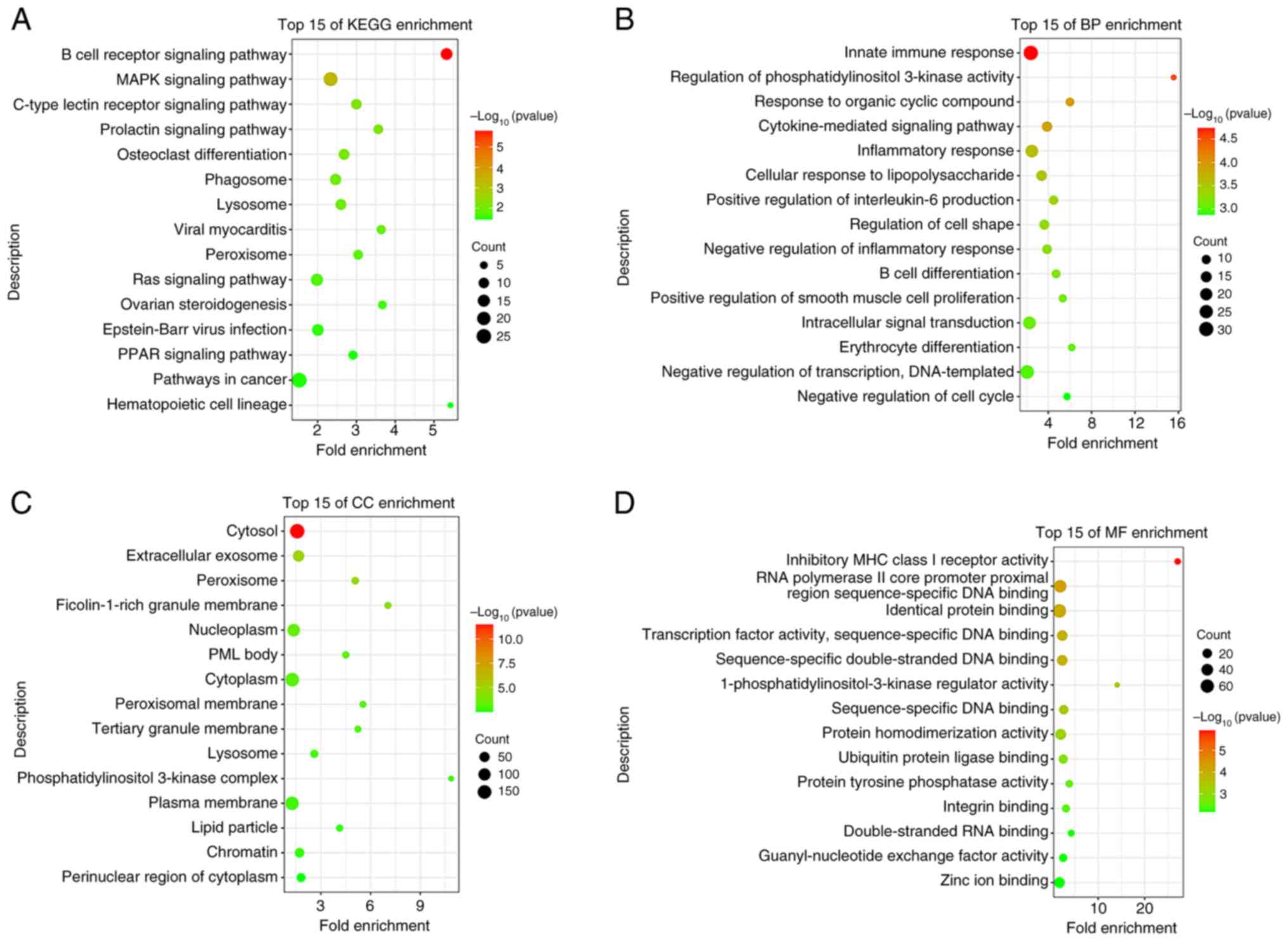 The linear models for microarray data package in the R programming language was used to analyze the GSE97779 dataset and produce the differentially expressed gene expression matrix. Correlation analysis was used to determine genes correlated with METTL14, using P<0.01 and |R|>0.6. For enrichment analysis, genes that were highly correlated with METTL14 were submitted to the DAVID database. According to the GO analysis, the enriched BP terms were associated with an ‘inflammatory response’, an ‘intimate immune response’, ‘IL-6 positive regulation’ and ‘cytokine-mediated signaling’ (Fig. 4B). In addition, the enriched CC and MF terms were associated with ‘peroxisome and peroxisomal membrane processes’ (Fig. 4C and D). The results of the KEGG analysis demonstrated that METTL14 was highly associated with the ‘MAPK signaling pathway’ (Fig. 4A). The MAPK pathway was selected for subsequent analysis, based on the P-value and count value of the result as the most enriched pathway relevant to the topic of this study.