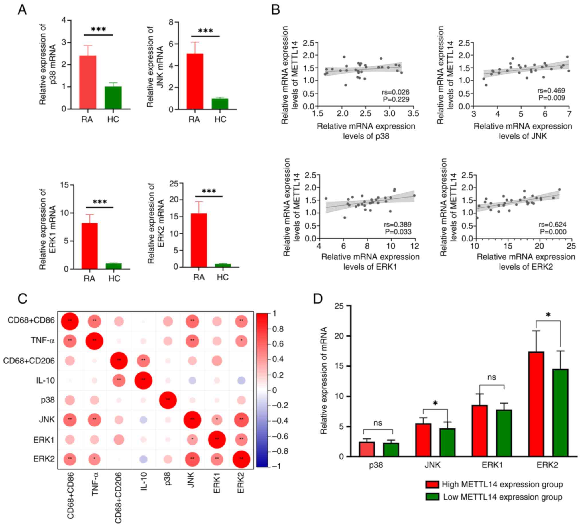 The results of the present study demonstrated that the expression levels of JNK, ERK2, p38 and ERK1 were markedly increased in the RA group, compared with those in the HC group (Fig. 5A). Notably, the results of the correlation analysis revealed that there was no statistically significant association between METTL14 and p38; however, there was a statistically significant correlation between METTL14 and JNK, ERK1 and ERK2 (Fig. 5B). In addition, there was a significant correlation between JNK, ERK2, TNF-α and CD68+CD86+ (Fig. 5C). Based on the median METTL14 expression level, patients with RA were divided into two groups; namely, METTL14 low-expression and METTL14 high-expression groups. It was revealed that the METTL14 high-expression group exhibited increased JNK and ERK2 expression levels compared with those in the METTL14 low-expression group; however, no statistically significant differences were observed in the expression levels of p38 and ERK1 between the groups (Fig. 5D). These findings indicated that METTL14 may increase downstream inflammatory responses via the MAPK signaling pathway.