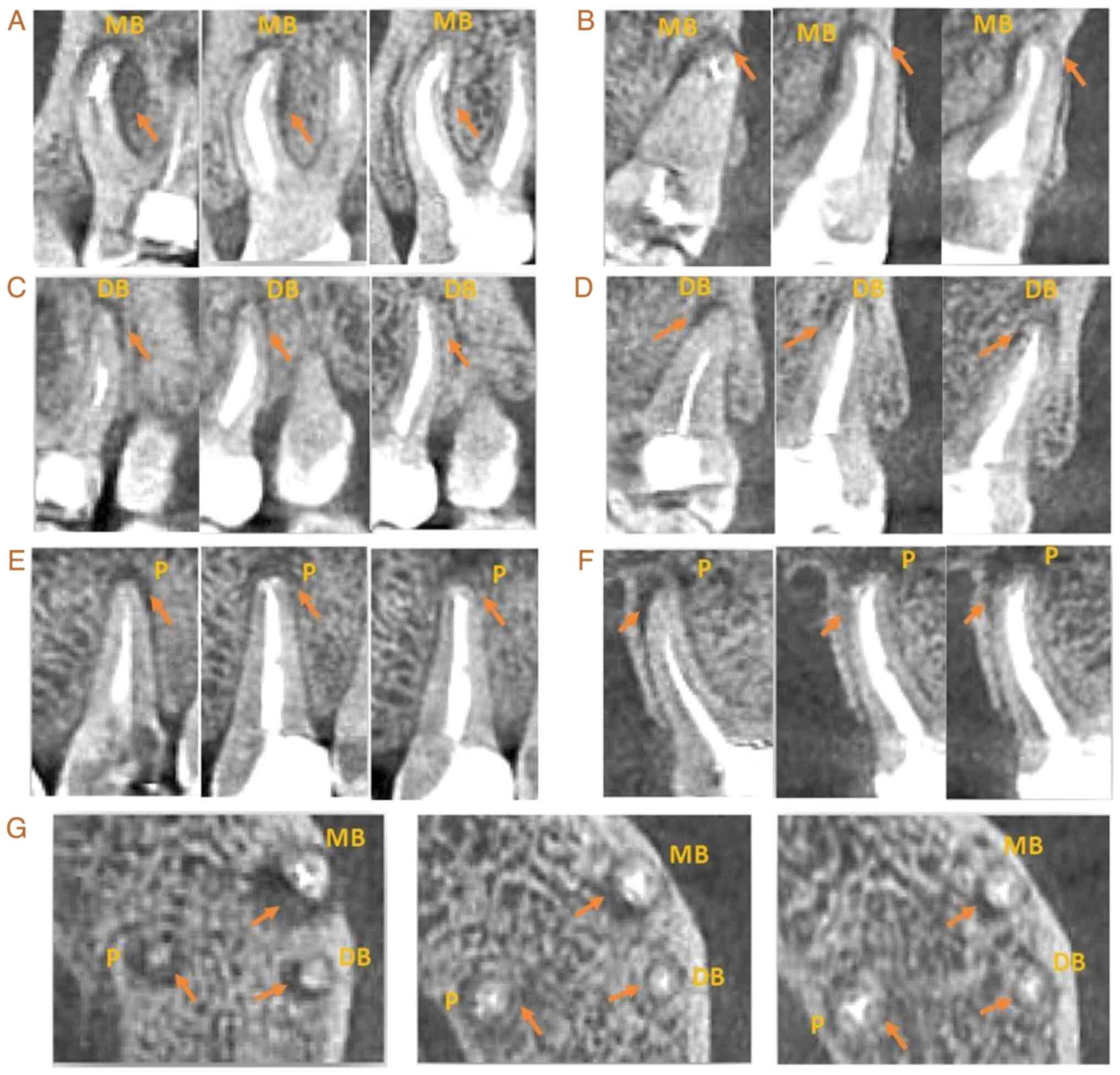 At 9 months after surgery, CBCT revealed that the hypodense area surrounding the DB, MB and P root apex had significantly diminished (Fig. 2). At 27 months after surgery, CBCT revealed that the hypodense areas surrounding the DB, MB and P root apex almost completely disappeared (Fig. 2).