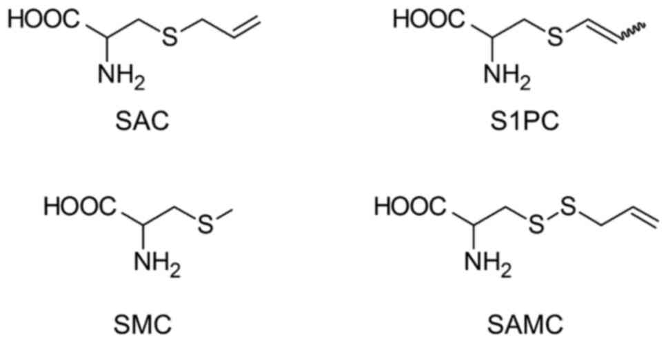 Amano H, Kazamori D, Itoh K and Kodera Y: Metabolism, excretion, and pharmacokinetics of S-allyl-L-cysteine in rats and dogs. Drug Metab Dispos. 43:749–755. 2015.PubMed/NCBI View Article : Google Scholar