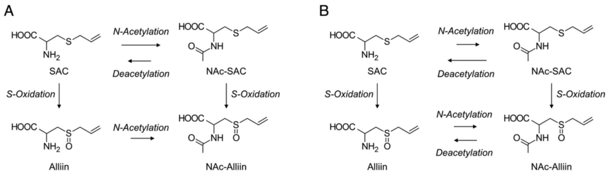 Park T, Oh JH, Park SC, Jang YP and Lee YJ: Oral administration of (S)-Allyl-L-Cysteine and aged garlic extract to rats: Determination of metabolites and their pharmacokinetics. Plant Med. 83:1351–1360. 2017.PubMed/NCBI View Article : Google Scholar