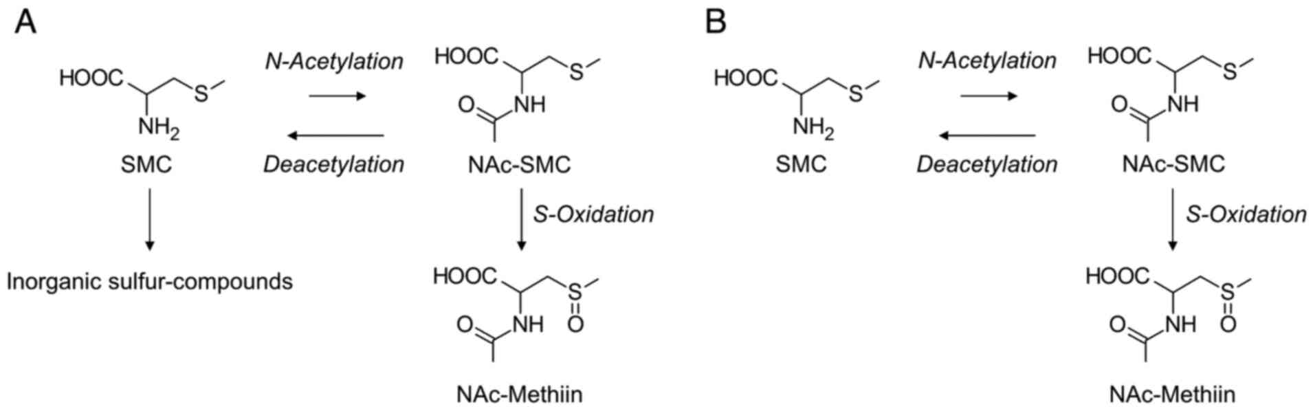 Mitchell SC, Smith RL, Waring RH and Aldington GF: The metabolism of S-methyl-L-cysteine in man. Xenobiotica. 14:767–779. 1984.PubMed/NCBI View Article : Google Scholar