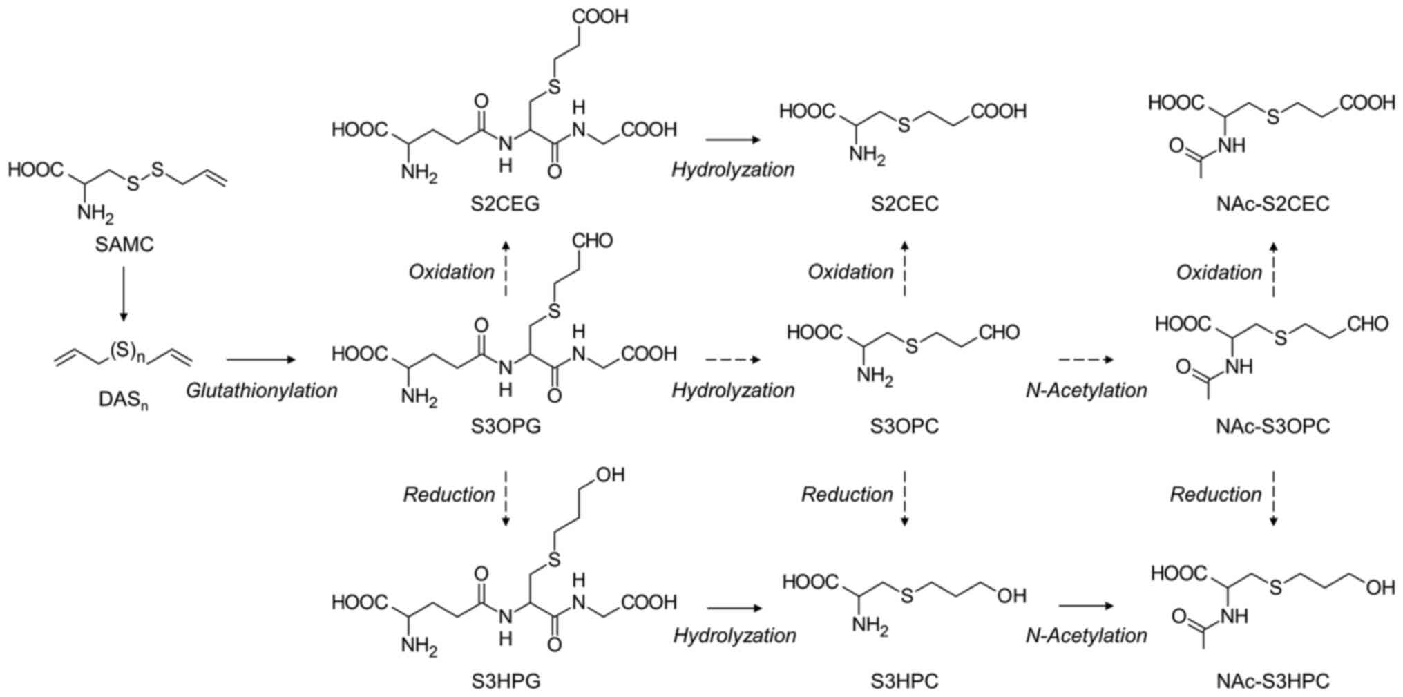 Nakamoto M and Kunimura K: Study of the metabolism of S-allylmercaptocysteine to elucidate its metabolites and metabolic pathway in rats. Eur Food Res Technol. 249:1377–1389. 2023.