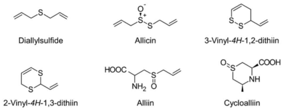 Lachmann G, Lorenz D, Radeck W and Steiper M: The pharmacokinetics of the S35 labeled labeled garlic constituents alliin, allicin and vinyldithiine. Arzneimittelforschung. 44:734–743. 1994.PubMed/NCBI(In German).