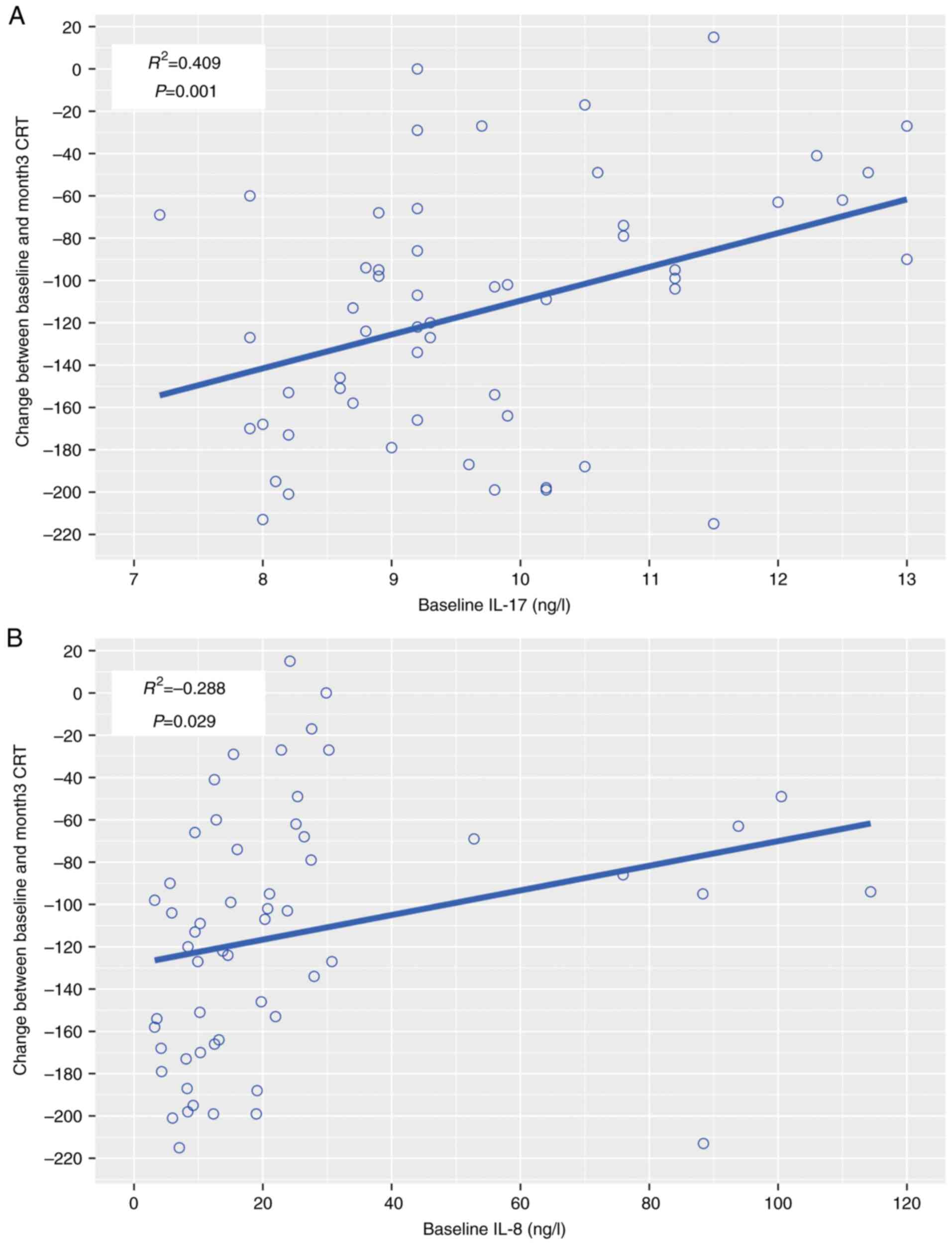 Significant correlations were found between baseline IL-17 and IL-8 concentrations and CRT. In the group with a favorable anatomic response, the level of IL-17 was 9.31±1.16 ng/l, while in the no anatomic response group, the level of IL-17 was 10.27±1.61 ng/l (P=0.02). A similar difference was found for IL-8, where the level in the favorable response group was 17.05±22.09 ng/l, and in the no anatomic response group, it was 34.50±28.62 ng/l (P<0.001). No significant differences were found in IL-6, IL-10, IL-1β, ICAM-1 and MCP1 (Table III). Multivariate logistic regression analysis revealed that both IL-17 and IL-8 were independent risk factors significantly associated with CRT (IL-17, P=0.003; IL-8, P=0.043; Table V). As in the multivariate linear regression, significant correlations were found for CRT and IL-17 (P=0.001, R2=0.409), as well as CRT and IL-8 (P=0.029, R2=0.288), in the scatter plots (Fig. 1A and B).