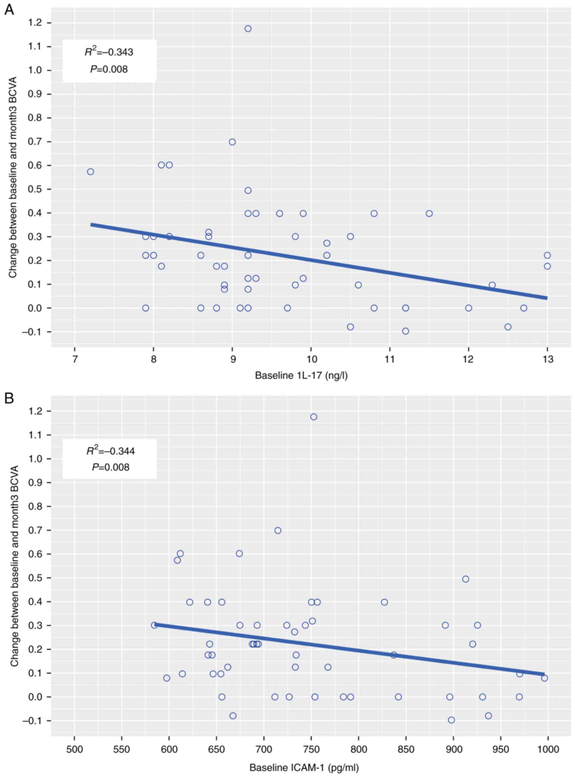 Significant correlations were found between the baseline concentration of IL-17 or IL-8 and ICAM-1 or BCVA. In the group with a favorable BCVA response, the level of IL-17 was 9.20±1.28 ng/l, while in the no BCVA response group, the level of IL-17 was 10.10±1.41 ng/l (P=0.018). IL-8 showed the same trend, as the level of IL-8 in the ‘response’ group and ‘no response’ group was 16.95±18.14 and 29.52±30.33 ng/l, respectively (P=0.023). The outcome was achieved with a significant decrease in the ICAM-1 concentration, as BCVA response of at least two sight lines improved (724.97±96.42 vs. 787.81±126.37 pg/ml, P=0.046; Table IV). Multivariate logistic regression analysis revealed that both IL-17 and ICAM-1 were independent risk factors significantly associated with BCVA (IL-17, P=0.030; ICAM-1, P=0.029) (Table V). As in the multivariate linear regression, significant effects were found for BCVA and IL-17 (P=0.008, R2=0.343), and BCVA and ICAM-1 (P=0.008, R2=0.344), in the correlation plots (Fig. 2A and B).