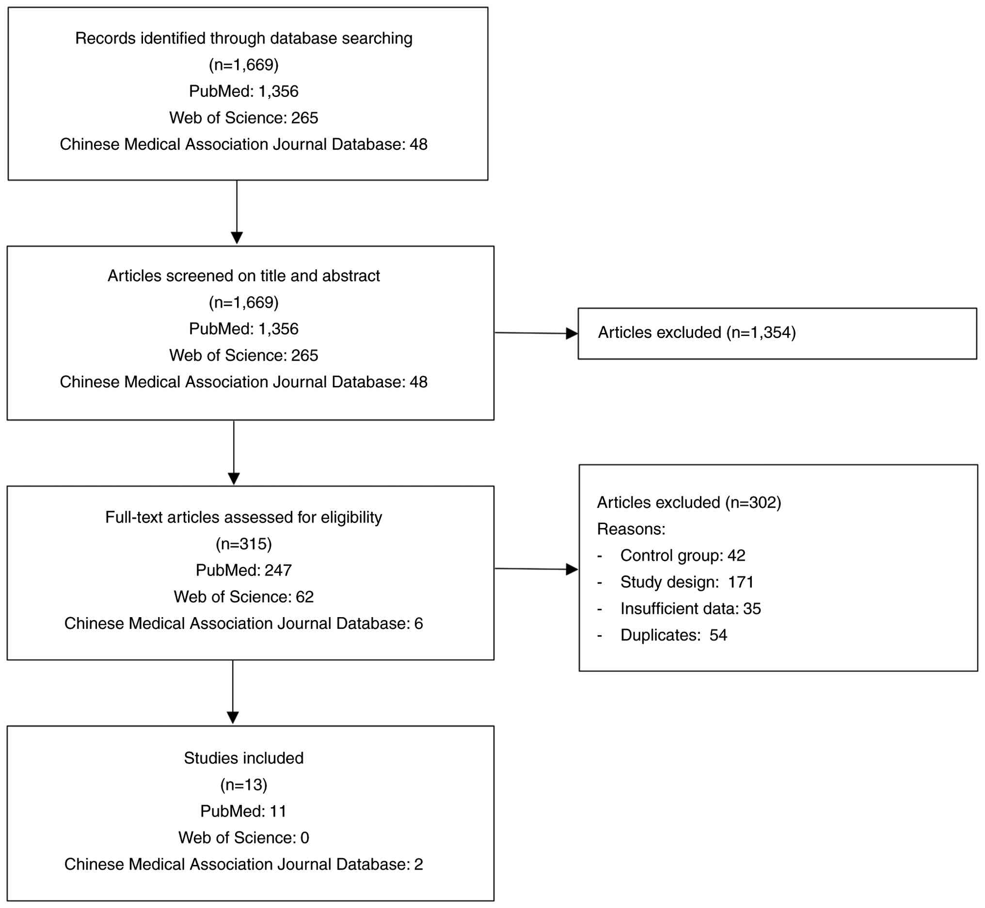 Database searches yielded 1,669 records, including 48 studies from the CMAJD. After screening the titles and abstracts, 1,354 records were excluded, leaving 315 articles for full-text review. Of these, 302 articles were excluded due to non-randomized study designs, lack of hepatic enzyme outcomes, absence of an appropriate control group or overlapping patient populations. Ultimately, the present meta-analysis included 13 RCTs (14-26), all of which were publicly available, with 11 studies identified from PubMed and two studies identified from the CMAJD (Fig. 1). These studies were published in the period of 2007-2024.