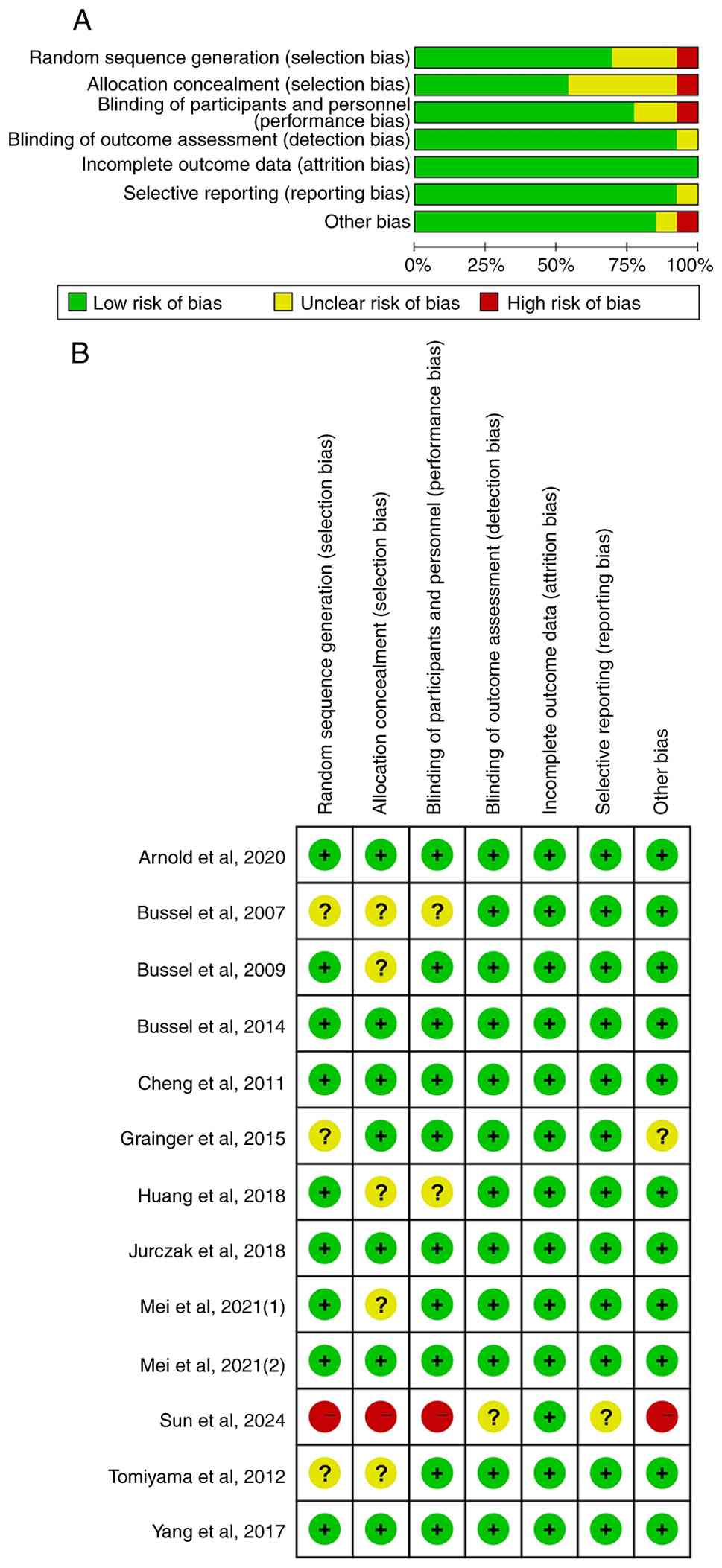 Methodological quality was assessed using the Cochrane Collaboration Risk of Bias (RoB) tool (version 2.0) (13). A total of two investigators independently assessed each RCT across the following seven key domains: i) Random sequence generation; ii) allocation concealment; iii) participants and personnel blinding; iv) outcome assessment blinding; v) incomplete outcome data; vi) selective outcome reporting; and vii) other potential sources of bias, such as baseline imbalances or inappropriate analytical methods. For each domain, signaling questions were answered according to the RoB 2.0 algorithm and rated as ‘low risk’, ‘unclear risk’ or ‘high risk’. Discrepancies between investigators were resolved by discussion and if consensus was not achieved, a third investigator was consulted. All quality assessments were conducted without blinding to study authorship or journal of publication and the final ratings were presented in tables or graphs to inform the interpretation of the pooled estimates.