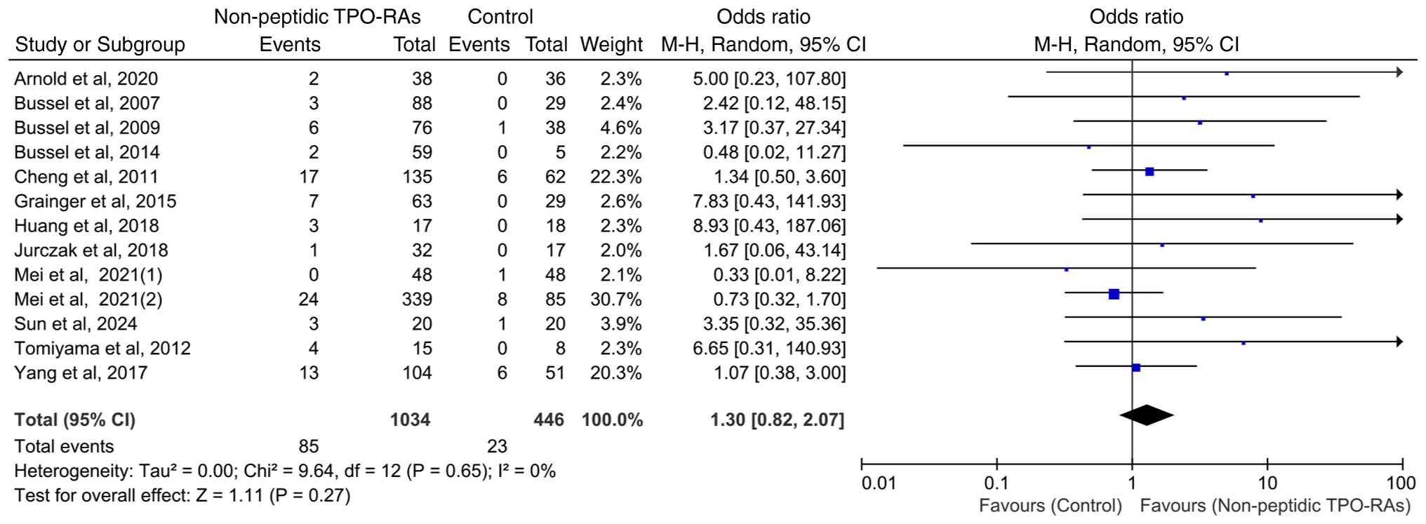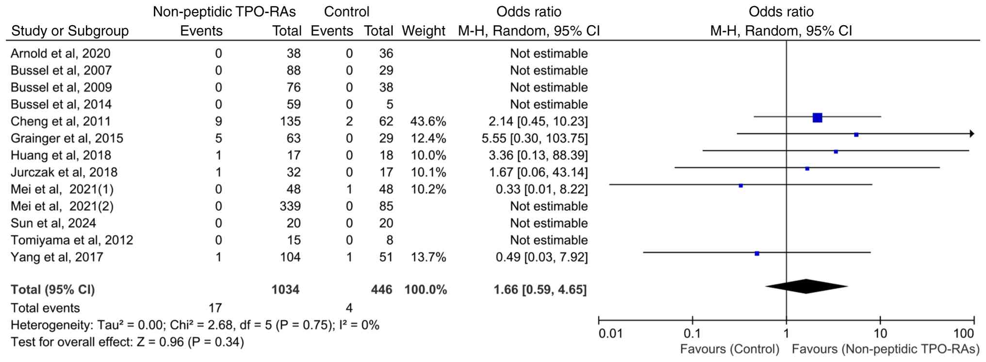 Hepatic enzyme elevation is classified as an adverse event of interest in the context of non-peptidic TPO-RA therapy (24,25). This concern stems from the fact that these agents are metabolized in the liver and that hepatic enzyme abnormalities have been reported in previous clinical trials and post-marketing surveillance (27-32). The present meta-analysis demonstrated that the incidence of hepatic enzyme elevation events during non-peptidic TPO-RA treatments for ITP (8.22%) was higher compared with that in the control group (5.16%). However, the difference was not statistically significant. In addition, the findings revealed that severe transaminase elevation events were rare in both cohorts and occurred at comparable rates in the intervention and control groups (1.64 vs. 0.90% respectively). These findings suggest that although hepatic enzyme elevation events were more frequent in the intervention group, severe transaminase elevation events were rare and should not necessarily be attributed to non-peptidic TPO-RA therapy.