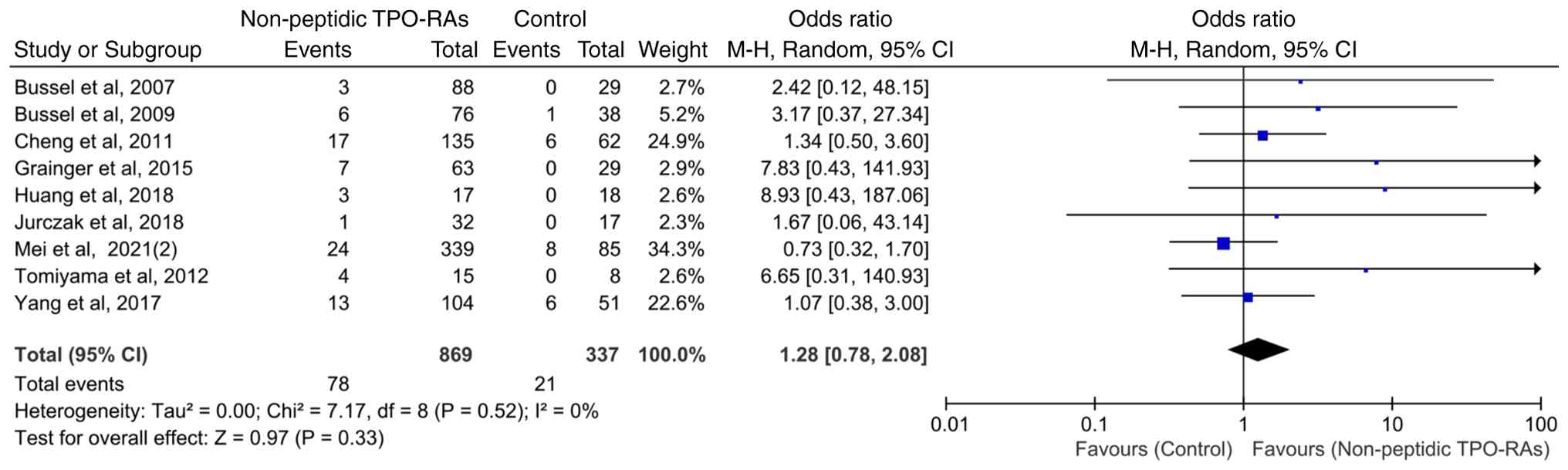 To assess the potential impact of treatment duration on hepatic enzyme elevation events, nine studies with a treatment duration of ≥6 weeks were analyzed. The heterogeneity among these studies was low (χ2=7.17; P=0.52; I2=0%), indicating good consistency among the trials. The pooled analysis demonstrated that compared with that in the control group, non-peptidic TPO-RA treatment lasting ≥6 weeks was not associated with a statistically significant increase in the incidence of hepatic enzyme elevation events (OR=1.28; 95% CI, 0.78-2.08; P=0.33; Fig. 4).