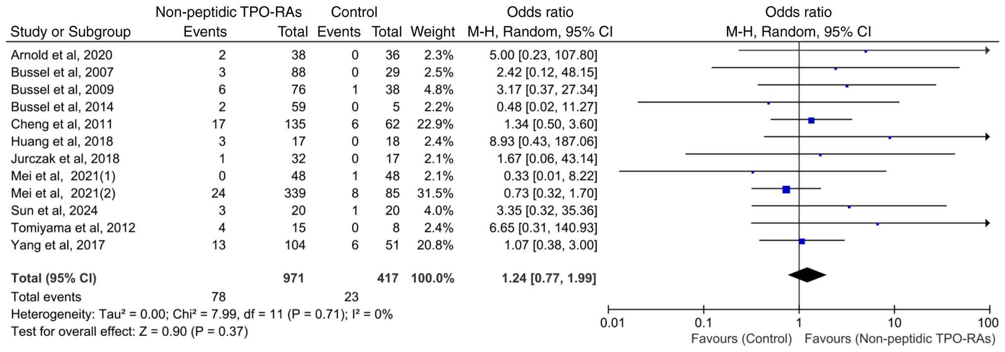 Of the 13 included RCTs, 12 exclusively enrolled adult participants. To ensure population homogeneity, separate analyses were conducted on all adult cohorts. The pooled results demonstrated no significant difference in the incidence of hepatic enzyme elevation events between patients treated with non-peptidic TPO-RAs and those in the control group (OR=1.24; 95% CI, 0.77-1.99; P=0.37), with no observed heterogeneity among studies (χ2=7.99; P=0.71; I2=0%; Fig. 5). Owing to the inclusion of only one pediatric study, no separate analysis was performed on cohorts of children.