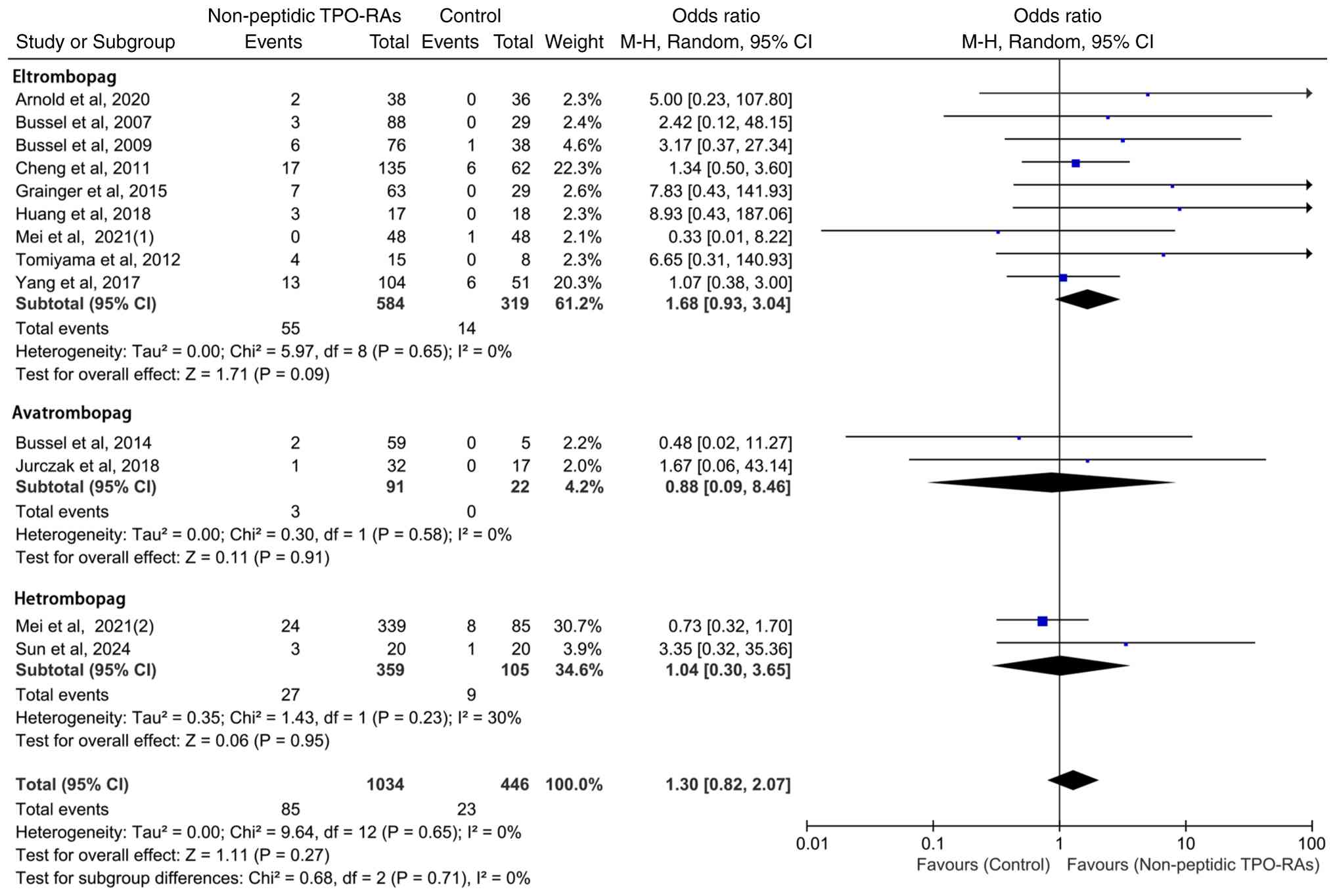 To facilitate comparison, the subgroup results for eltrombopag, avatrombopag and hetrombopag are presented within a single integrated forest plot, which allows for clear visualization of the ORs and 95% CIs whilst avoiding unnecessary fragmentation into multiple figures. Based on this layout, a subgroup analysis was performed to further assess the hepatic safety profiles of individual non-peptidic TPO-RAs. Eltrombopag (OR=1.68; 95% CI: 0.93-3.04; P=0.09) and hetrombopag (OR=1.04; 95% CI: 0.30-3.65; P=0.95) demonstrated a trend toward increased risk when compared with the control group, whereas avatrombopag (OR=0.88; 95% CI: 0.09-8.46; P=0.91) exhibited a trend toward reduced risk (Fig. 6). Notably, no statistically significant differences in hepatic enzyme elevation events were observed between any of the agents and their respective controls.