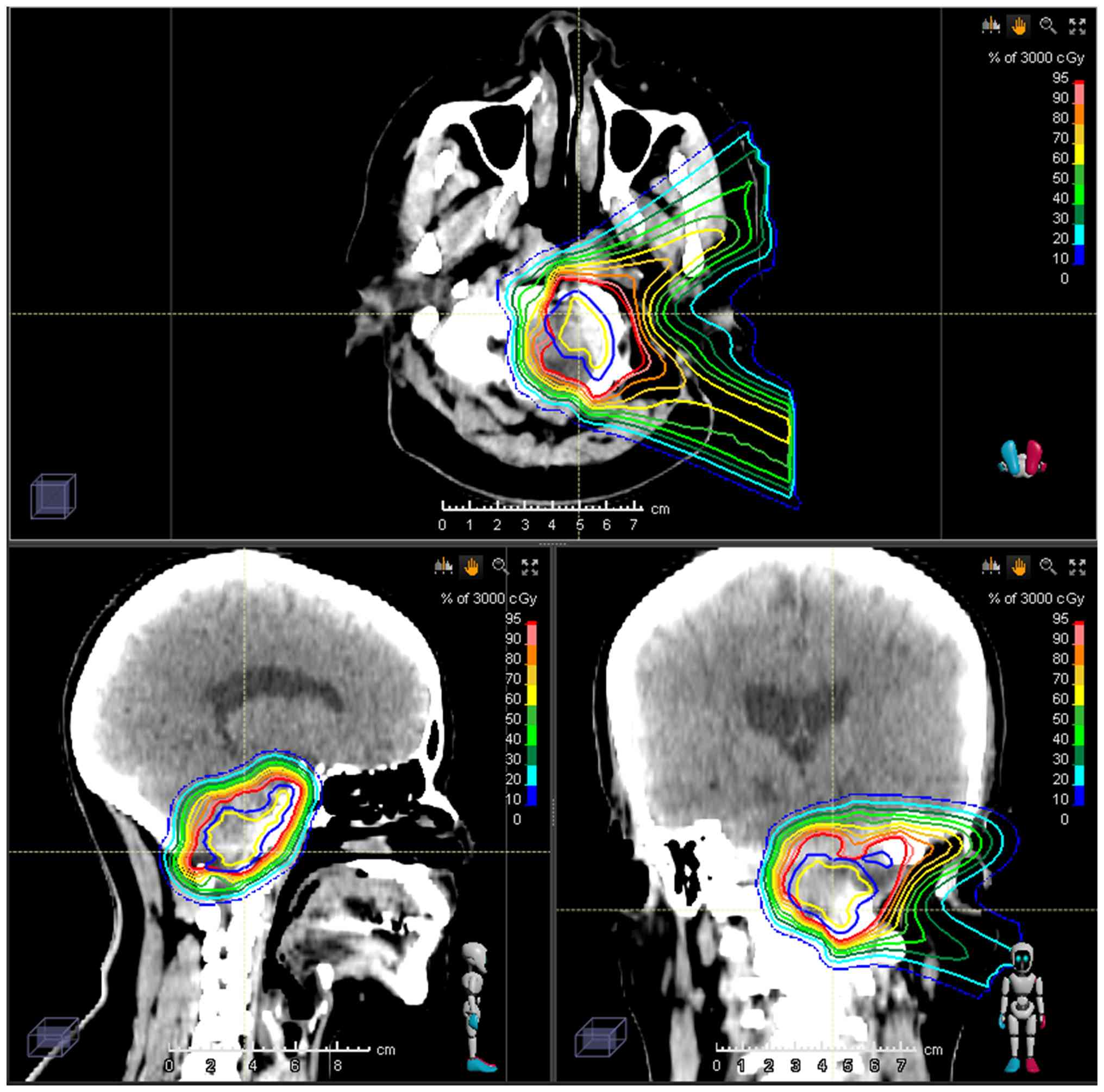 As OARs, the cochlea received 44.61 Gy in 15 fractions (EQD2, 55.48 Gy, assuming α/β=2) and the brainstem received 34.1 Gy in 15 fractions (EQD2, 36.42 Gy, assuming α/β=2) (Fig. 2).