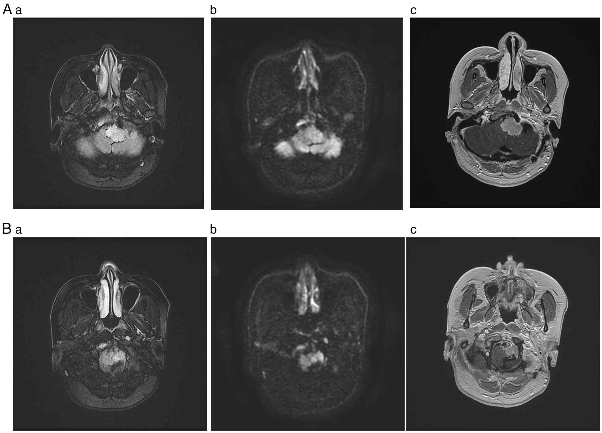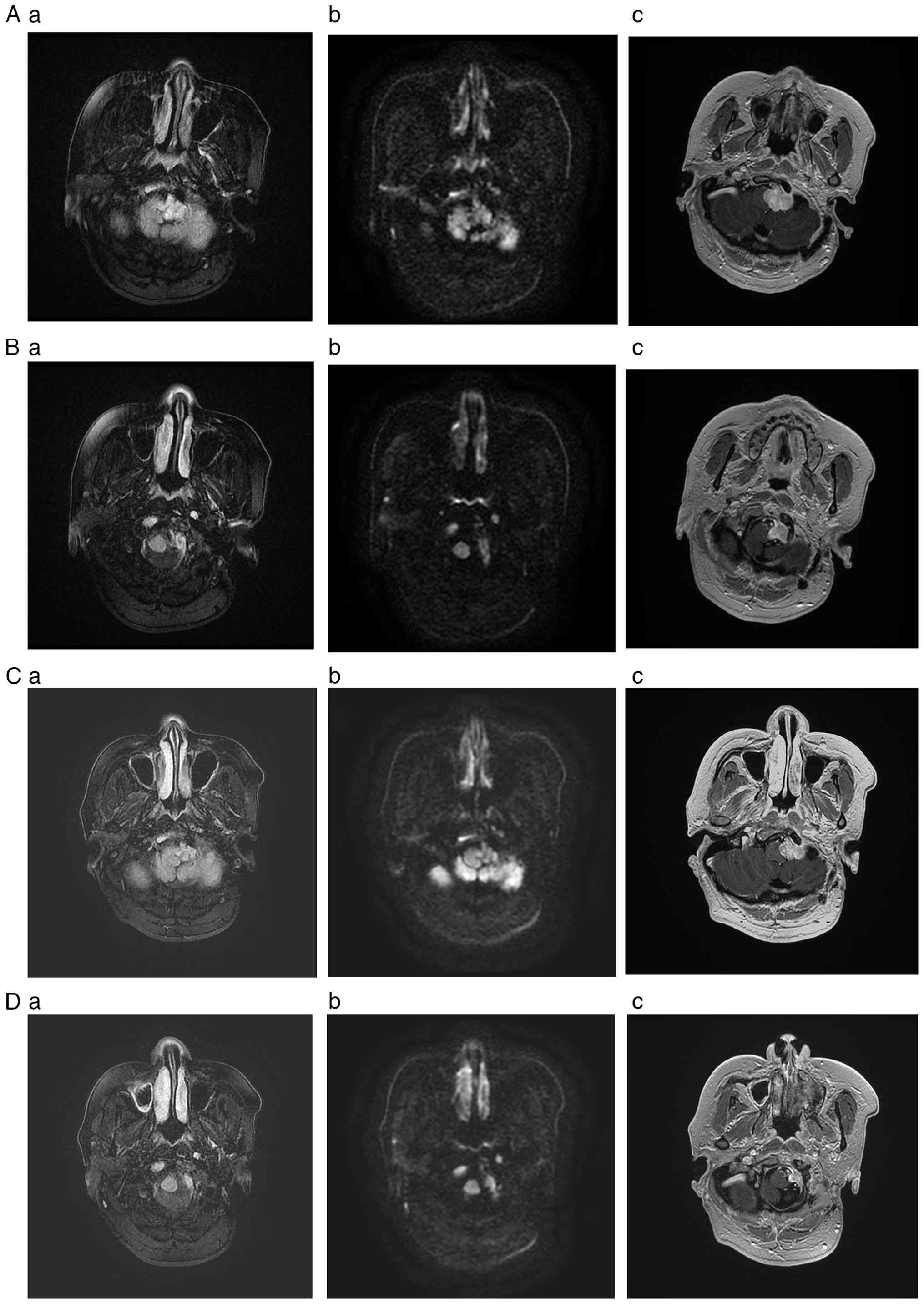 In August 2014, the patient also developed hoarseness. Left vocal cord paralysis was observed using a laryngeal fiberscope, so standard oral neurotrophic therapy (drug name and dose unknown) was initiated at Fangshan Chinese Medicine Hospital (Beijing, China), again without improvement. Another month after this, the patient presented with left-sided tongue deviation and dysphagia during liquid intake. According to the patient's medical history records from Zhuozhou Chinese Medicine Hospital (Zhuozhou, China), a space-occupying lesion was visible on magnetic resonance imaging (MRI). This lesion involved the left cerebellopontine angle, which raised suspicion of a primary tumor at the jugular foramen. The patient underwent a left paraganglioma resection via the retroauricular transmastoid and labyrinthine approach, combined with abdominal fat filling for cavity obliteration at the Chinese People's Liberation Army General Hospital (Beijing, China).