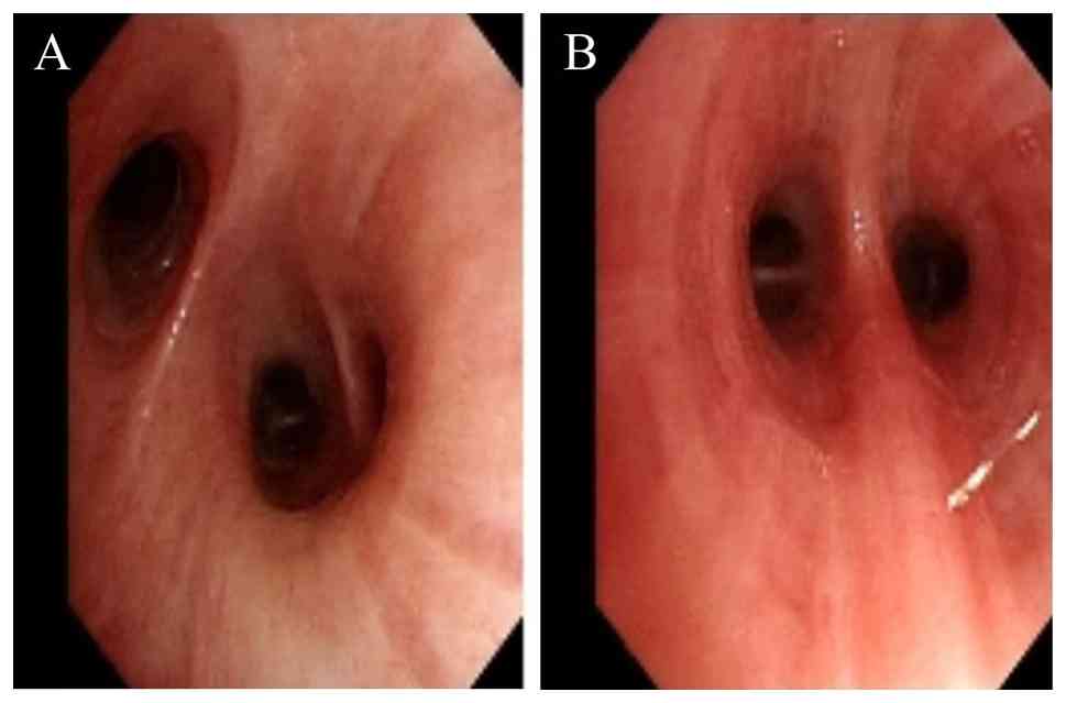 A thorough physical examination was performed, including assessment of vital signs (temperature, blood pressure, heart rate and respiratory rate). Lung auscultation revealed clear breath sounds in the left lung, while a few fine crackles were audible in the right lung fields. No wheezes or rhonchi were noted. No chest tenderness was noted on palpation. Cardiac examination indicated normal heart sounds without murmurs, gallops or rubs and no jugular vein distention was observed. Abdominal examination was unremarkable, with a soft abdomen, lack of tenderness or rebound tenderness, normal bowel sounds (4-5 times/min) and lack of peripheral edema. Lymph node examination revealed no palpable lymphadenopathy in the cervical, axillary or inguinal regions. Neurological and musculoskeletal evaluations showed no focal deficits such as limb weakness and sensory disturbance or joint abnormalities such as swelling and tenderness. A chest CT scan obtained in October 2023 (Fig. 1) indicated patchy and nodular opacities with slightly increased density and ill-defined borders. Test results for 1,3-β-D-glucan, erythrocyte sedimentation rate, C-reactive protein, endotoxin and procalcitonin were within normal ranges (Table I). Legionella pneumoniae, Chlamydia pneumoniae, Mycoplasma pneumoniae, respiratory viruses, coronavirus disease of 2019 and HIV were negative in serological testing. The results for autoantibodies were still negative. Diagnostic tests, including sputum smear and bacterial culture yielded negative results. The patient was diagnosed with community-acquired pneumonia (CAP) and empirical treatment with moxifloxacin was initiated. During hospitalization, moxifloxacin was administered intravenously at a daily dose of 0.4 g. To identify the etiology of the illness, the patient underwent bronchoscopy, which revealed edematous bronchial mucosa (Fig. 2). In addition, the bronchoalveolar lavage fluid (BALF) was analyzed using mNGS. The sequencing of mNGS was performed by Adicon Clinical Laboratories, Inc. (Hangzhou, China). The service report indicated qualified internal and negative controls, host read removal, nucleic acid extraction concentration of 0.11 ng/µl, and library concentration of 29.60 ng/µl. Sequencing QC metrics included 17,699,043 total reads, 1,252,093 non-human reads, and 96.37% Q30. Microbial identification was conducted by comparing sequencing reads to reference microbial nucleic-acid databases, with T. whipplei detected at a total of 19,731 base pairs (bp), a coverage of 2.26%, and an average depth of 1.01X. The report also described a machine learning-based pipeline for error correction, denoising, and exact sequence inference. Antibiotic resistance gene interpretation referenced the CARD database. The results identified T. whipplei (sequence number: 399; relative abundance: 0.08%) as the only pathogen (Fig. 3). After treatment for 8 days, the patient's symptoms improved, with cough resolution and normalization of body temperature. Following discharge, the patient continued oral moxifloxacin at a daily dose of 0.4 g for 1 week and remained in good health. A follow-up chest CT scan in November 2023 (Fig. 4) indicated complete resolution of the bilateral patchy/nodular opacities. A telephone follow-up was conducted after discharge. The patient reported that she was in good health and had not experienced any further complications. The patient declined to visit the hospital for follow-up examinations, including a chest CT scan.