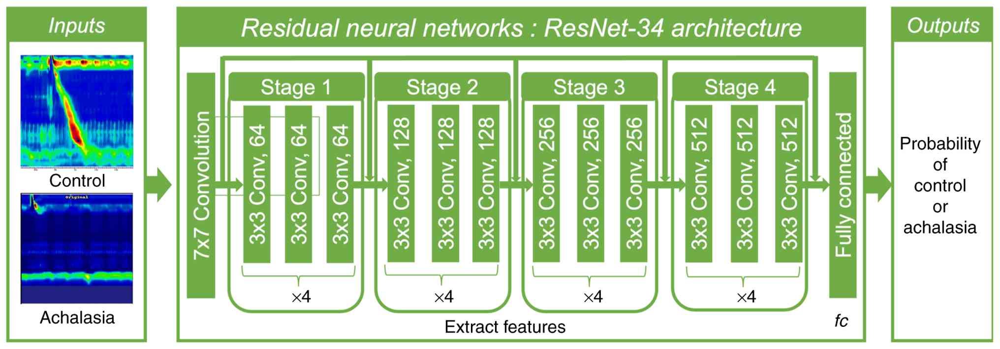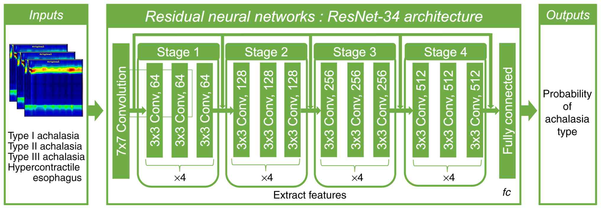 Achalasia was predicted by using the CNN. The ResNet-34 network was used as the backbone of the encoder network to encode the downsampling layer of the image. The model was trained using Python 3.8 (Python Software Foundation, Beaverton, OR, USA), Pytorch 1.8.1 (The Linux Foundation), and an Nvidia RTX A6000 graphics card. The achalasia prediction training process utilized a mean-squared error loss function and an Adam optimizer with a batch size of 4; the learning rate decreased linearly from 5e-4 to 1e-6.