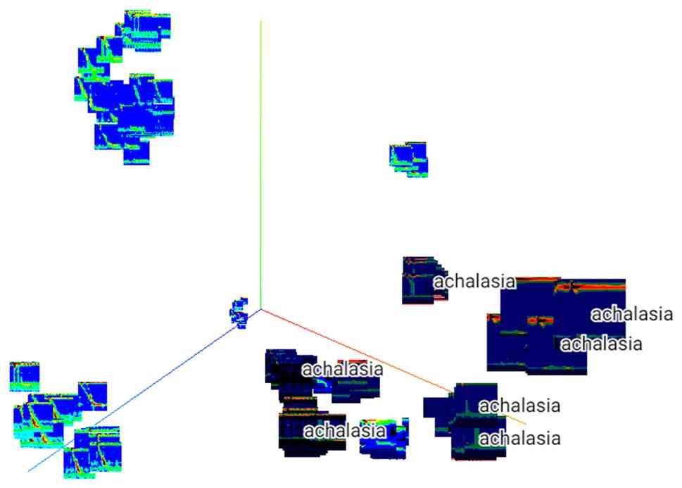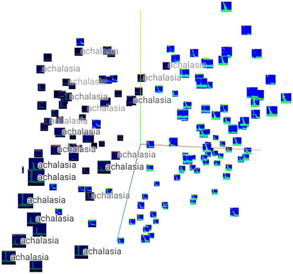 Owing to the nearly 100% correct response rate, and despite the small dataset, PCA was performed on the characteristics of the dataset. The HRM of patients with achalasia was distributed mainly on the left side of Fig. 3, indicating that the features of each HRM image differed between the controls and patients with achalasia. Similarly, a 3D-tSNE analysis, a dimensionality removal method, was performed (Fig. 4), which showed that the achalasia group could be further subdivided into several groups, suggesting the possibility of extracting features using an achalasia-type classification.